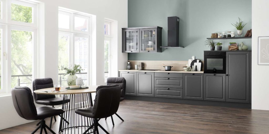 Front in 3D-Lacklaminat, Graphit softmatt, Korpus in Graphit, Arbeitsplatte in GTD Graphit,