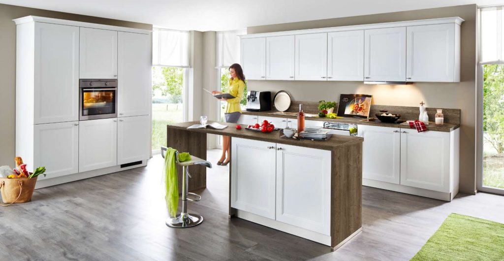 Front in Weiß softmatt, Korpus in Premium-weiß, Arbeitsplatte in Eiche Barriqué.