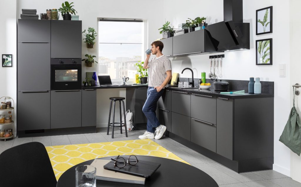 Front und Korpus in Grafit, Arbeitsplatte in Schiefer struktur schwarz.
