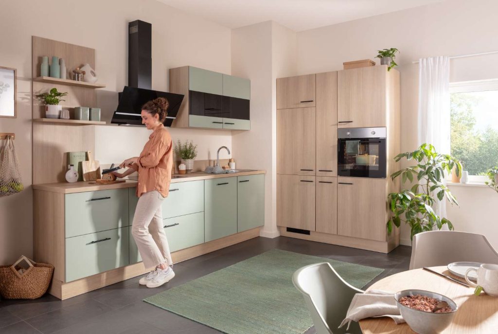 Einbauküche Front in Salbeigrün + Eiche Summerfield Nachbildung, Korpus + Arbeitsplatte in Eiche Summerfield Nachbildung. Stellmaß: ca. 345x215 cm. Geschirrspüler nach Wahl gegen Mehrpreis.