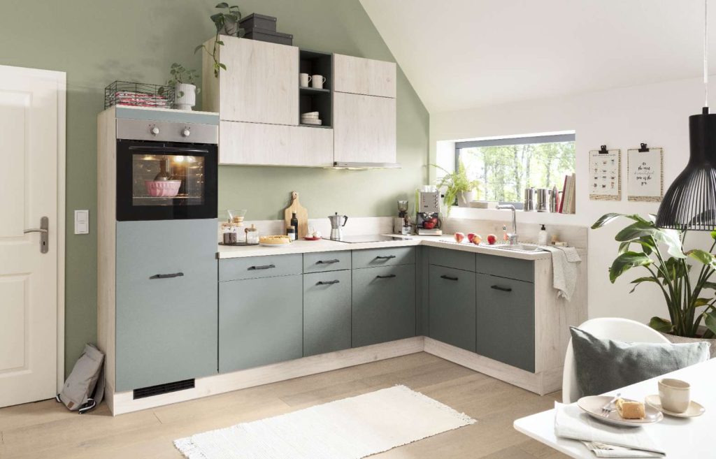 Bemerkung Einbauküche Front in Thymian und Seeahorn- Nachbildung, Korpus und Arbeitsplatte in Seeahorn-Nachbildung. Stellmaß: ca. 285x165 cm. Geschirrspüler nach Wahl gegen Mehrpreis.