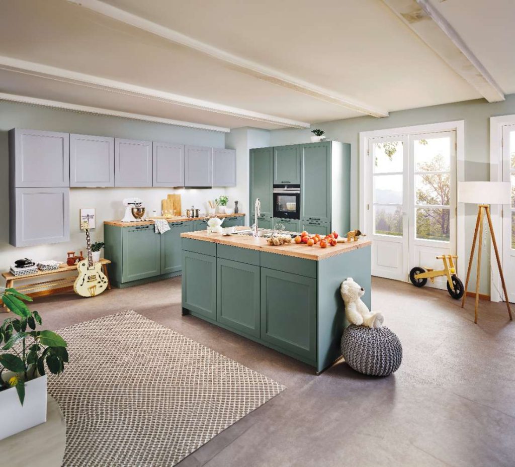 Front und Korpus in Lacklaminat, Schilf und Steingrau, Arbeitsplatte in Eiche Artisan Nachbildung.