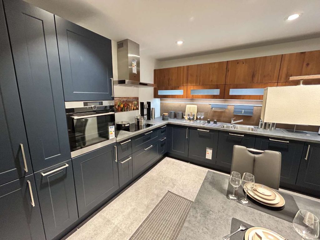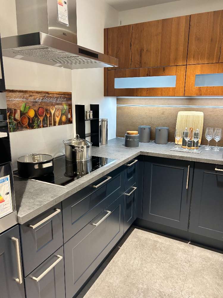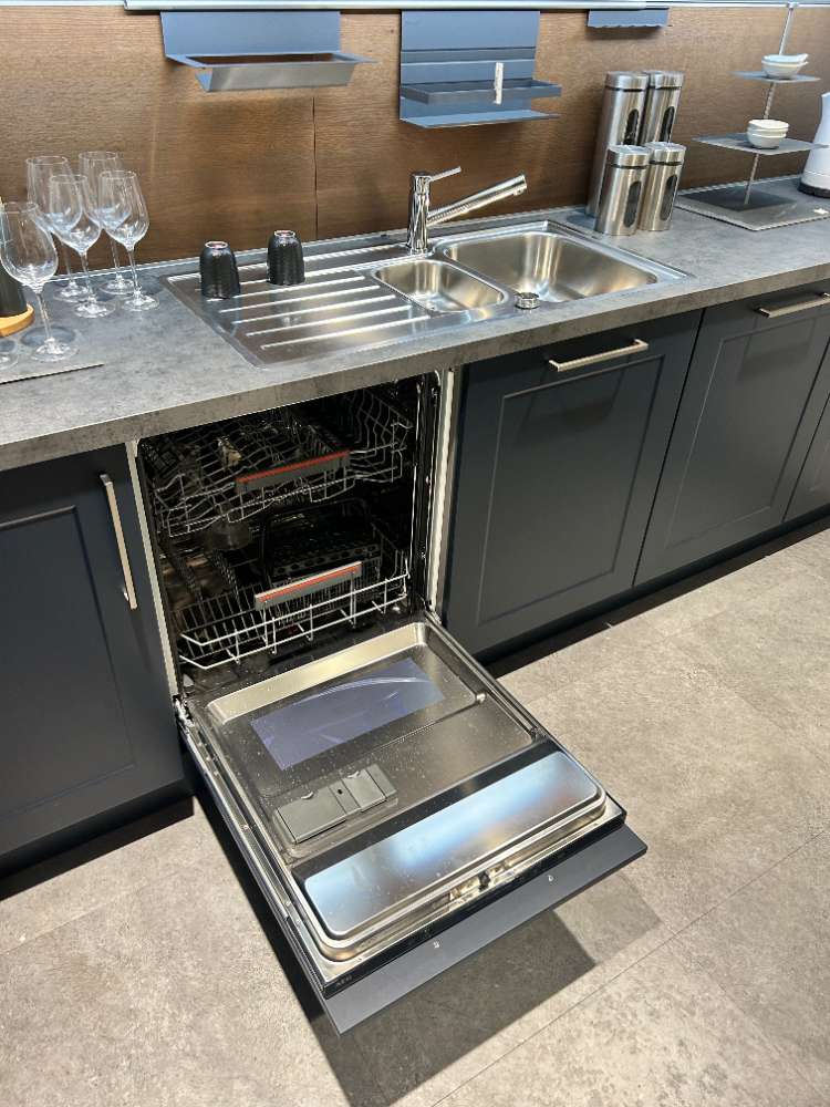 *Mit Elektrogeräte und Spüle Geschirrspüler: AEG-Vision Front: Tiefblau softmatt Korpus: Quarzgrau Apl: Steel Griff: Relinggriff EST-Optik Nach Typenaufstellung und Skizze
