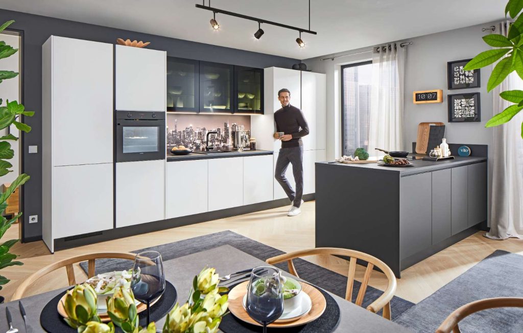 Einbauküche vito® Front in UV-Lack, Weiß supermatt + Schwarz, Korpus in Weiß, Arbeitsplatte in Schwarz Steinstruktur. Stellmaß: ca. 430+215 cm. Geschirrspüler und Muldenlüfter nach Wahl gegen Mehrpreis.