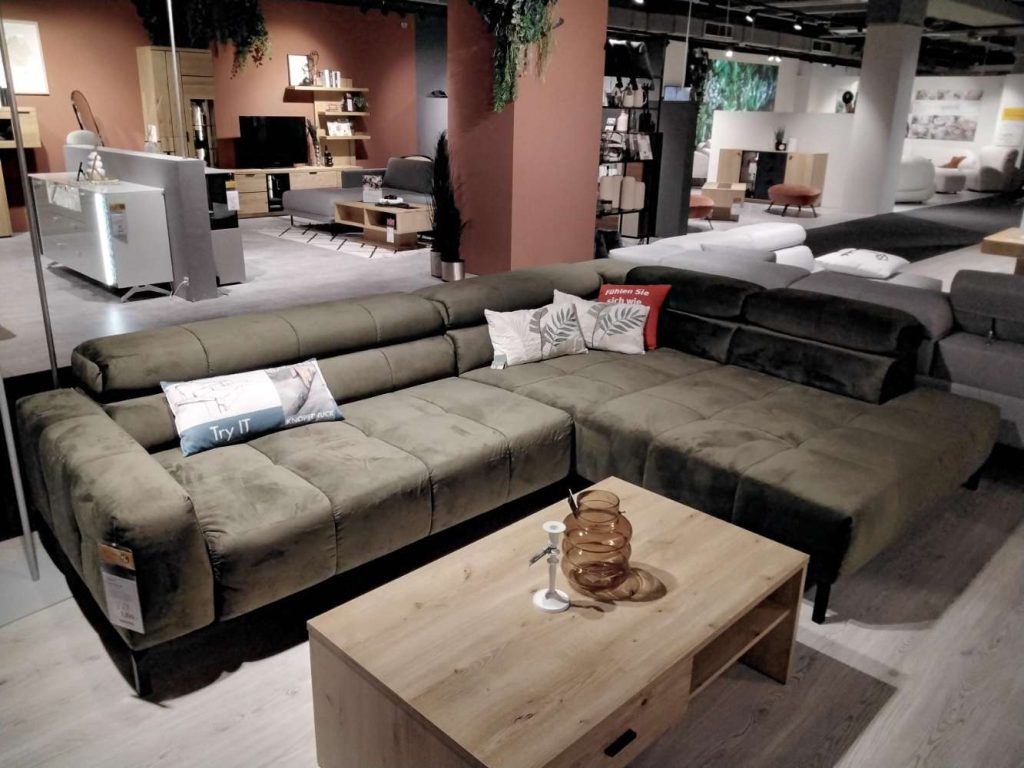 AusführungStellmaß: ca. 308 x 219 cm, Bezug: Velvet Oliv, bestehend aus 2-Sitzer mit Armlehne links, Umbauecke groß und 2-Sitzer mit Armlehne rechts, Sitzkomfort: PUR-Schaum, Metallfuß: Schwarz matt, Sitzhöhe: ca. 42 cm inkl. motorischem Sitzvorzug am 2-Sitzer
