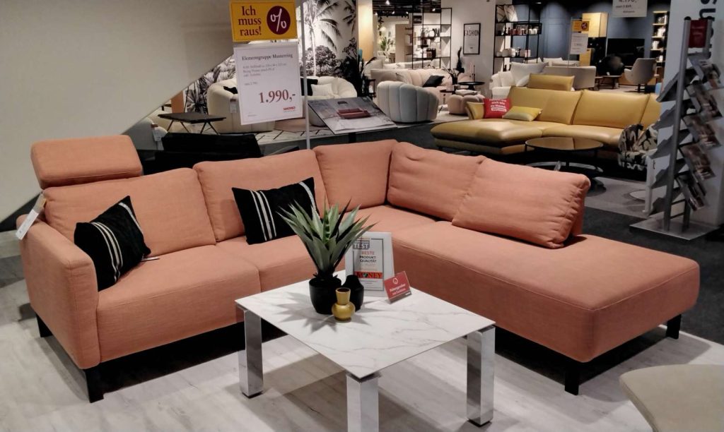 AusführungStellmaß ca. 256x84x233 cm, Bezug Picasso peach PG 8, Sitztiefe: ca. 55 cm, Rücken Super Soft, Sitzhöhe: ca. 47 cm (Komforthöhe), Metallfuß schwarz matt inkl. einer Kopfstütze XL, ca. 25x50 cm