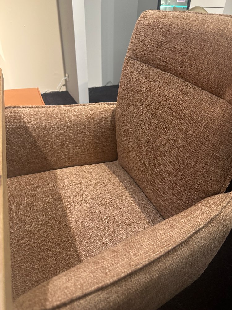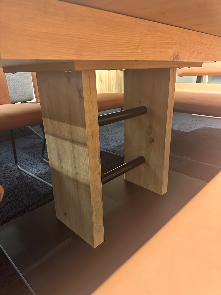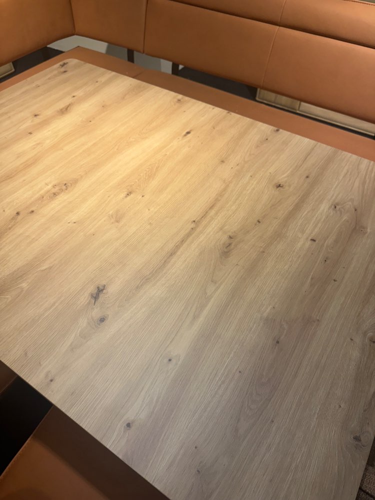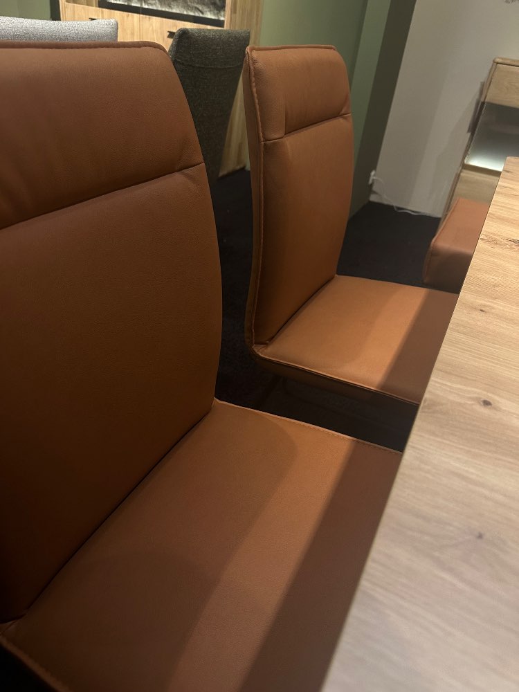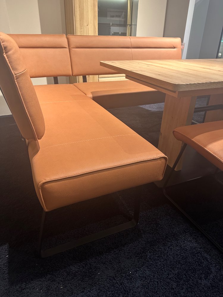 BemerkungModerne Eckbankgruppe bestehend aus: Esstisch ausziehbar ca. BHT 130(179)x75x90cm in Artisaneiche Nachbildung, Eckbank von vorne gesehen links ca. 169x94cm, rechts ca. 153x94cm in Microfaser caramel und Gestell Metall schwarz, 2x Stuhl in Microfaser caramel und Rundrohrkufen schwarz, Armlehnstuhl mit Drehfunktion in Stoff lightbrown und Stativgestell in schwarz