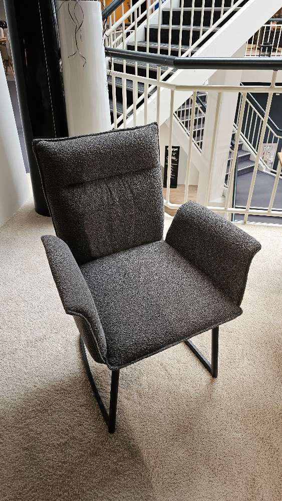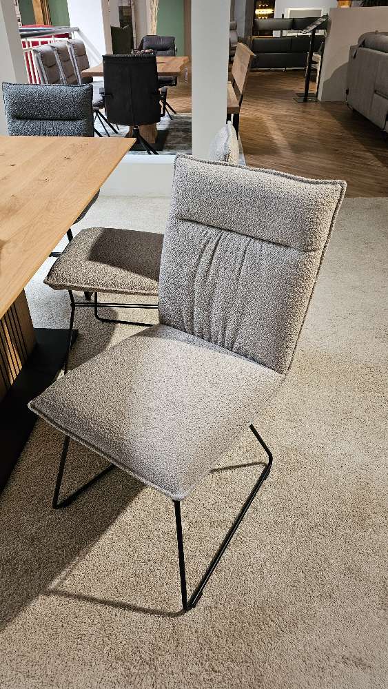 BemerkungErleben Sie eine perfekte Kombination aus Funktionalität und Stil mit dem Modell 5106, einem vielseitigen Schiebeplattentisch mit edlem Charakter. Die massive Platte aus Charakter-Eiche, vollendet mit einem Hydro-UV Hartwachs Öl-Finish, offenbart eine beeindruckende Facette, die durch eine 100 cm Falteinlage variabel erweiterbar ist. Das markante Säulengestell in Lamellen-Optik verleiht dem Tisch einen modernen Touch, während die kräftige schwarze Bodenplatte einen stabilen Stand bietet. Begleitet wird dieser Tisch von eleganten Stühlen, die in zwei Ausführungen ohne Armlehnen und mit Armlehnen erhältlich sind: beide bieten dank ihrer legeren Sitzpolsterung und Wellen-Federung außergewöhnlichen Komfort. Der Webstoff Alpin in natürlichen Grau- und Naturnuancen verleiht den Stühlen eine dezente Eleganz, während die schwarzen Eisen-Kufen und Schwinger-Gestelle für zeitlose Stabilität sorgen. Die Sitzhöhe von ca. 48 cm und die angenehme Sitztiefe von etwa 46 cm garantieren eine komfortable Sitzposition. Dieses Set aus Ausstellungsware bietet nicht nur praktischen Nutzen, sondern auch ein ästhetisches Highlight für jeden Wohnraum.