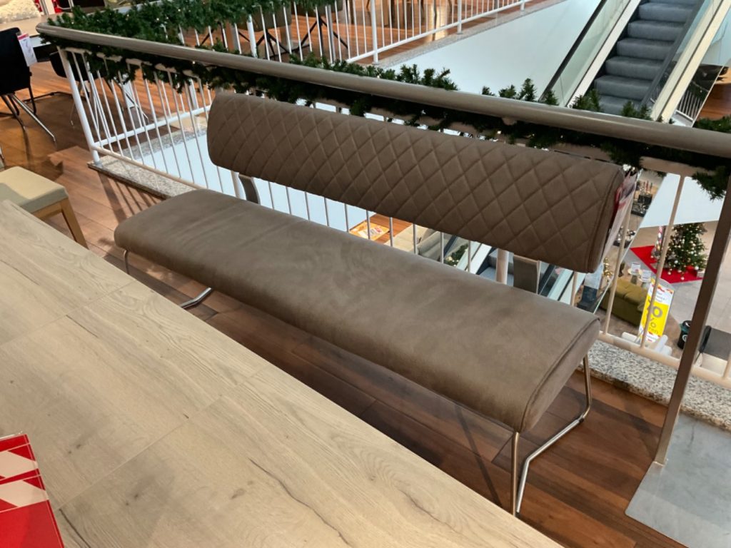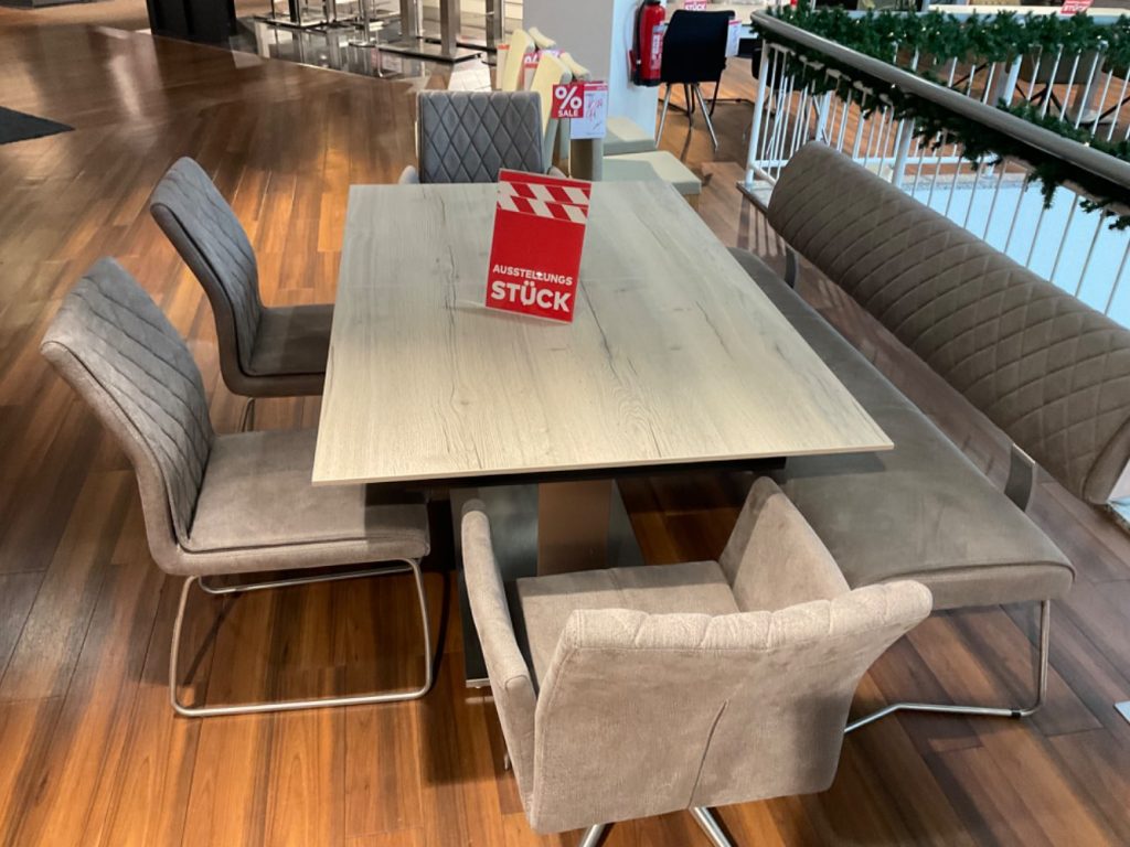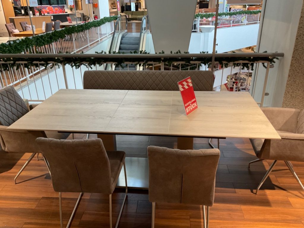 Tisch : Gestell Edelstahl / Platte HPL- 3D Struktur Halifac Eiche Weiß