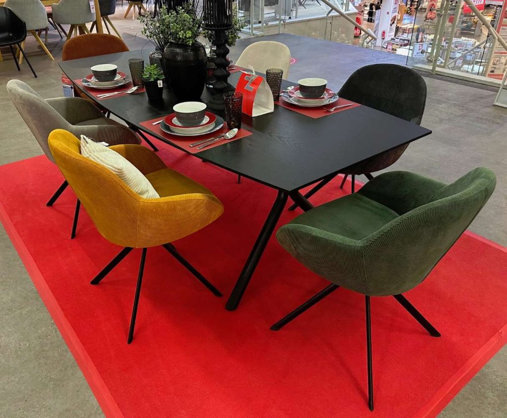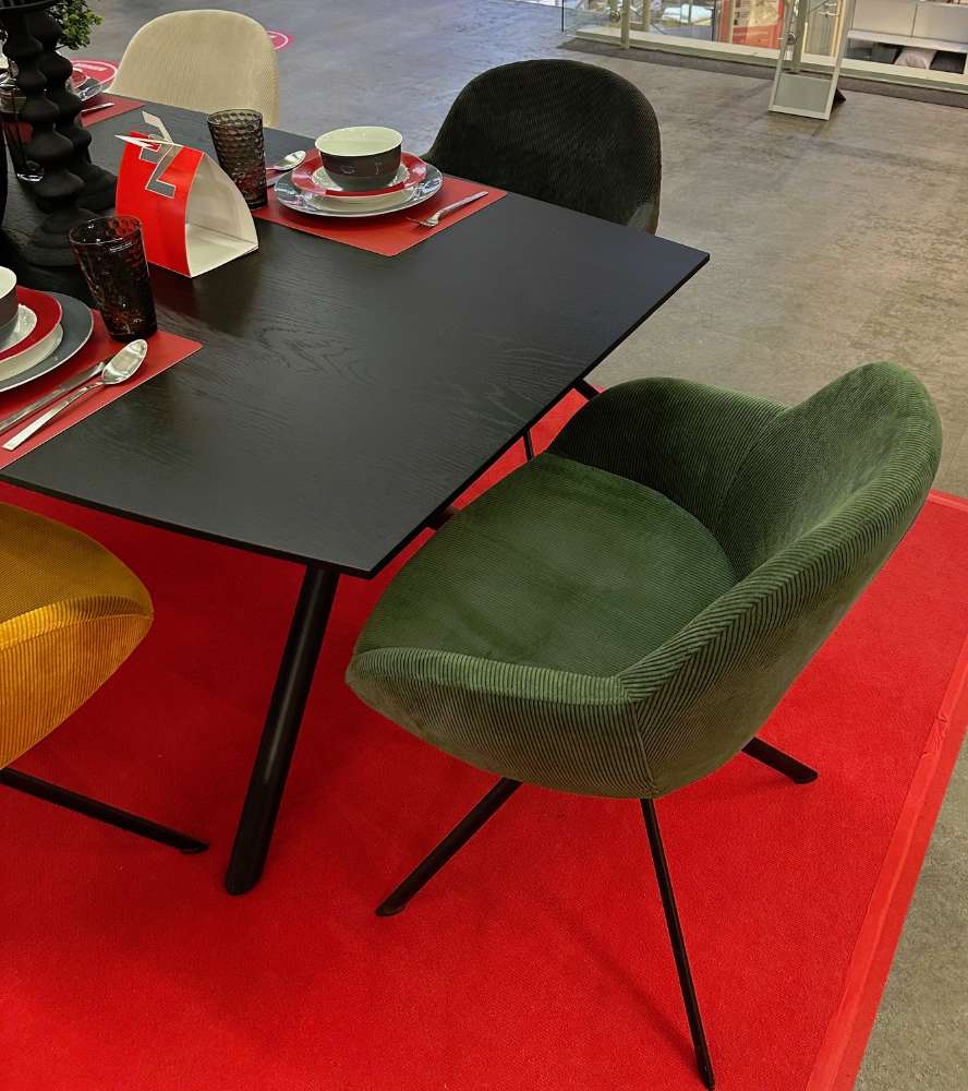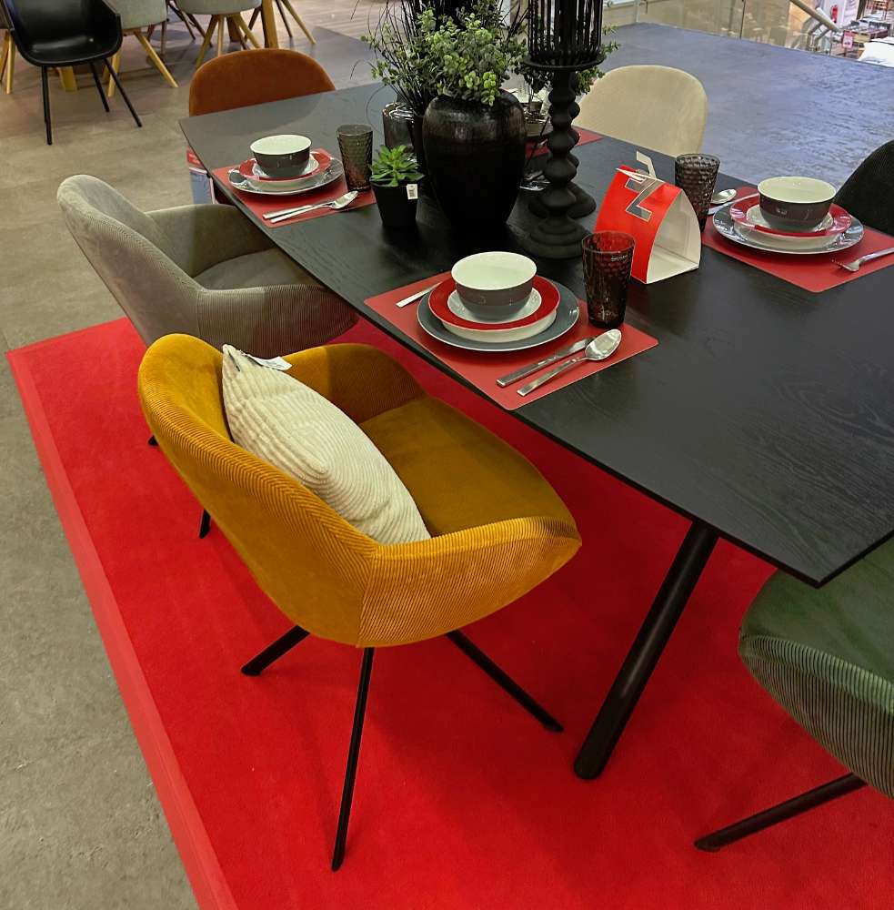 Esstisch: - Tischplatte Echtholz furniert Eiche - Gestell:Soft-X Metall schwarz - Tisch in Bootsform - ca. BT 220x100cm Stühle: - 1x Cord Fjord anthrazit, Stativ-Gestell Eisen schwarz, nicht drehbar - 1x Cord Fjord copper, Stativ-Gestell Eisen schwarz, nicht drehbar - 1x Cord Fjord green, Stativ-Gestell Eisen schwarz, nicht drehbar - 1x Cord Fjord apricot, 180 drehbar, Rückholfunktion - 1x Cord Fjord creme, 180 drehbar, Rückholfunktion - 1x Cord Fjord grey, 180 drehbar, Rückholfunktion