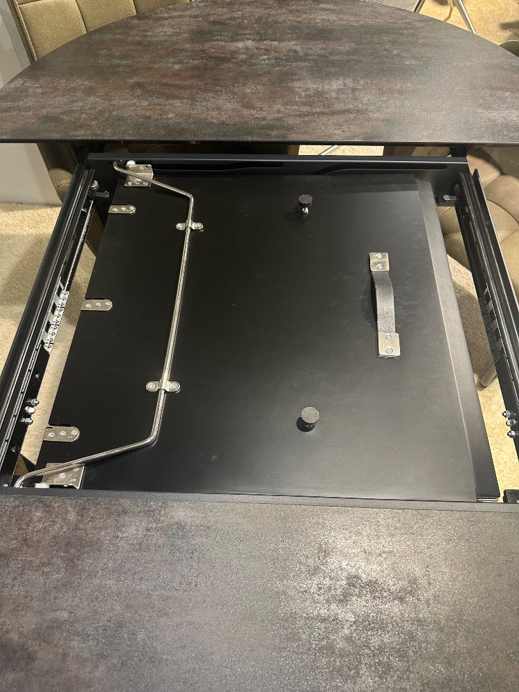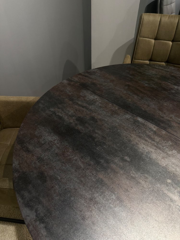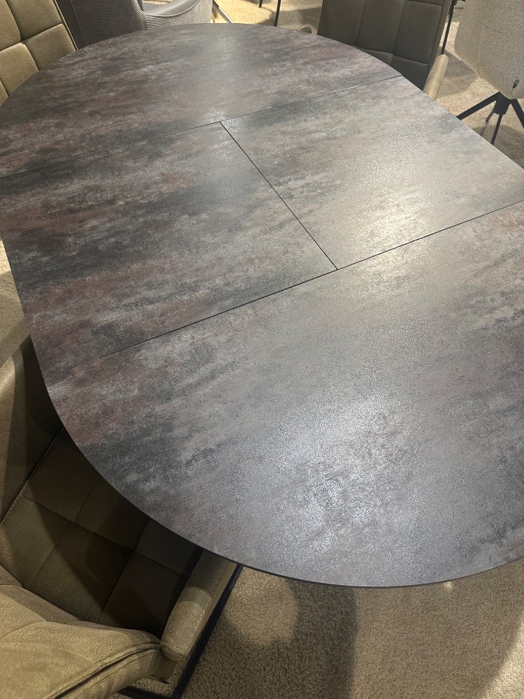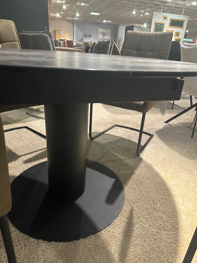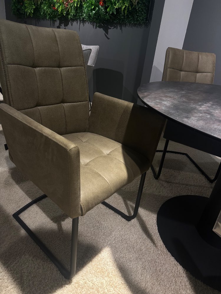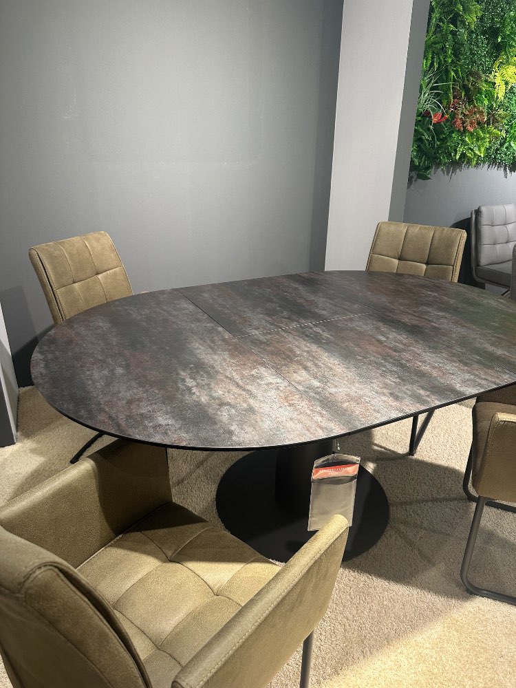 BemerkungSchöne Essgruppe bestehend aus: Esstisch rund und ausziehbar (ca. 120(180)cm Durchmesser), Platte aus Glaskeramik und Gestell in schwarz, 4x Schwingstuhl mit Armlehnen in Microfaser grün, Rundrohrgestell in schwarz