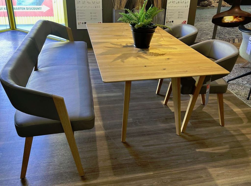 BemerkungEntdecken Sie mit Vcuben living die perfekte Kombination aus Stil und Funktionalität für Ihr Esszimmer. Dieser Austellungsgegenstand besticht durch seinen eleganten Esstisch mit Schrägfuß, der in den Maßen 100 x 76,5 x 200 cm großzügigen Platz für Ihre Gäste bietet. Die Klappeinlage, aus massivem Holz gefertigt, verlängert den Tisch um zusätzliche 100 cm, wodurch er ideal für besondere Anlässe wird.