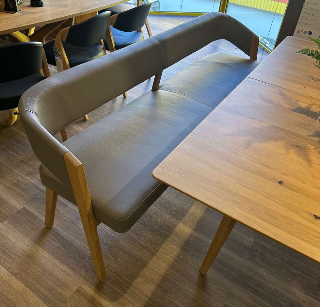 Die dazugehörige Bank der Decker A. Möbelwerke GmbH bietet dank ihres anthrazitfarbenen Lederbezugs und des bequemen Kaltschaum-Sitzes nicht nur Komfort, sondern auch ein edles Erscheinungsbild. Mit Maßen von 208 x 86 x 64 cm und einer Sitzhöhe von 51 cm, kombiniert mit einer Sitztiefe von 57 cm, lädt diese Bank zum längeren Verweilen ein.