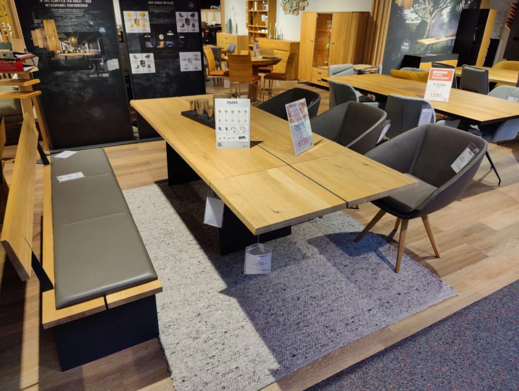 BemerkungDer Esstisch "Zweigl" von WIMMER in der Farbe Assteiche bianco vereint stilvolle Eleganz mit funktionaler Vielseitigkeit. Der Tisch, gefertigt aus hochwertigem Massivholz, strahlt durch seine geölte Oberfläche eine natürliche Wärme aus, die in jedem Esszimmer für eine einladende Atmosphäre sorgt. Mit den Maßen von 200 x 95 cm bietet er ausreichend Platz für gesellige Runden, die mit der 50 cm Ansteckplatte spielend erweitert werden können, um auch größere Gesellschaften zu beherbergen. Begleitet wird der Tisch von drei komfortablen Sesseln, die dank der praktischen Drehfunktion Bewegungsfreiheit gewähren, und einer Bank mit Sitzpolster, die zusätzlichen Komfort bietet. Die solide Bauweise und das Holzstativ als Füsse unterstreichen die Robustheit und Stabilität dieses Möbelstücks, welches als Austellungsware einen besonderen Charme versprüht. Die Kombination aus Massivholz und Leder verleiht dem Set eine luxuriöse Note, die sowohl in modernen als auch klassischen Wohnräumen herausragend zur Geltung kommt.