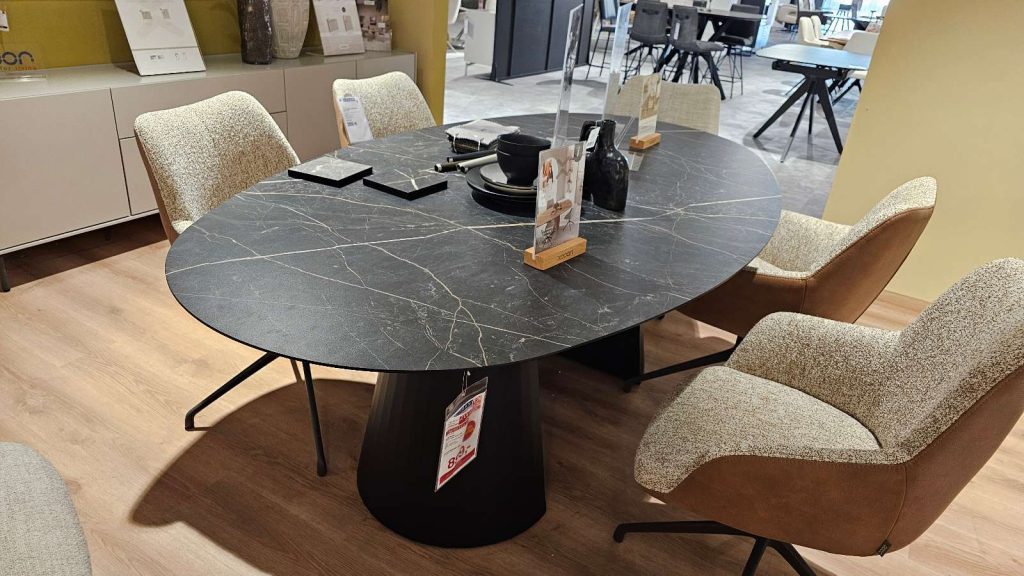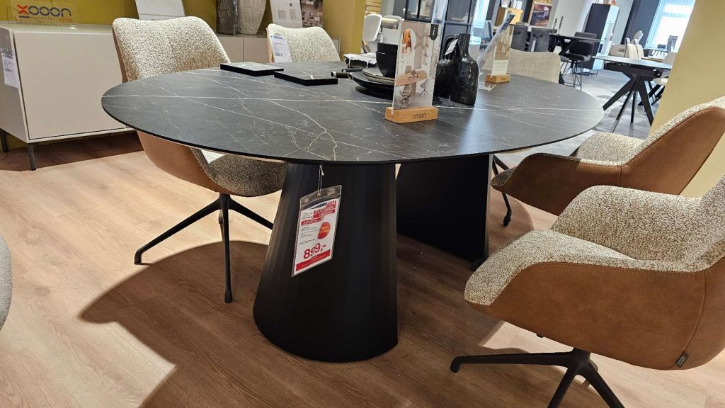 BemerkungDer Arabax 46400-ONX von XOOON verkörpert modernes Design in seiner schönsten Form. Dieses Möbelstück, gefertigt in eleganter Marmoroptik, ist perfekt für stilvolle Innenräume konzipiert und bietet nicht nur visuelle Anziehungspunkte, sondern auch Funktionalität. Die Tischplatte aus Primo Laminato High-Pressure Laminate (HPL) besticht durch ihre raffinierte elliptische Form und fügt sich harmonisch in jedes Raumambiente ein. Die marmorierte Oberfläche verleiht dem Tisch ein luxuriöses Erscheinungsbild, während das robuste, schwarz gehaltene Metallgestell eine stabile Basis bietet und der minimalistischen Ästhetik entgegenkommt. Mit seinen beeindruckenden Maßen von 210x77x120 cm bietet der Arabax 46400-ONX genügend Platz für gemeinsame Momenten und schafft eine einladende Atmosphäre. Er eignet sich hervorragend als Zentrum eines jeden Raumes und kombiniert eindrucksvoll modernes Design mit praktischer Anwendung. Als Ausstellungsware verkörpert dieses Möbelstück innovative Möbelkunst und höchste Qualität von XOOON.