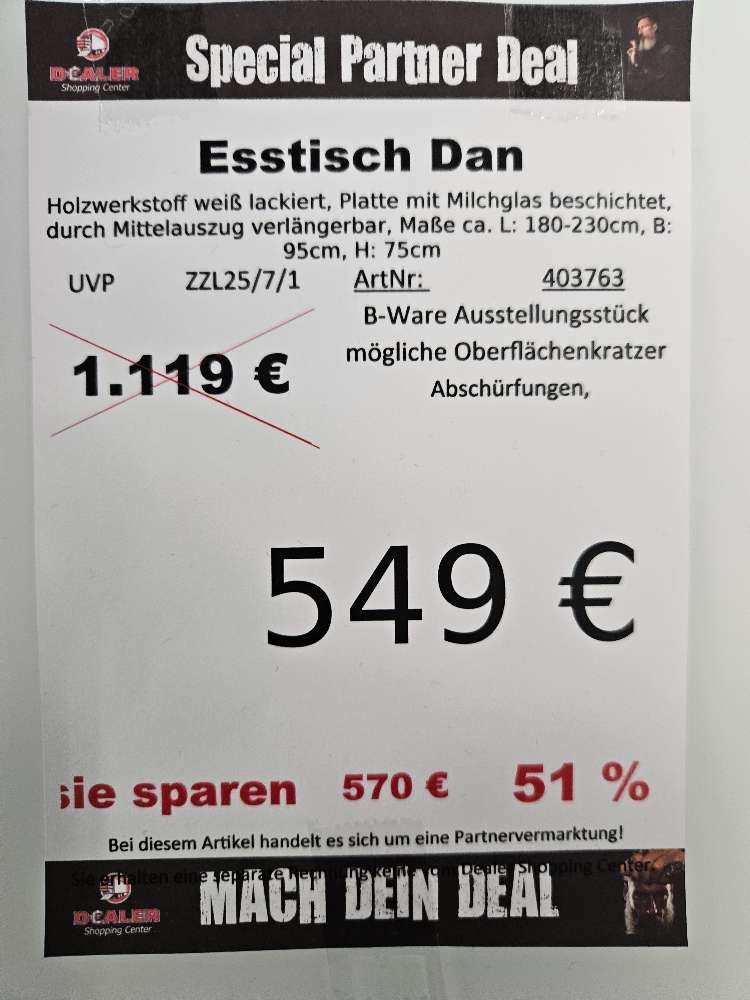Esstisch Dan weiß lackiert Milchglas statt 1119€
