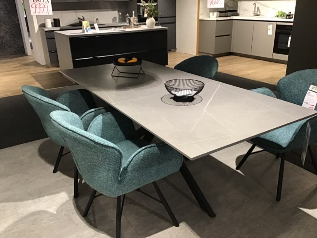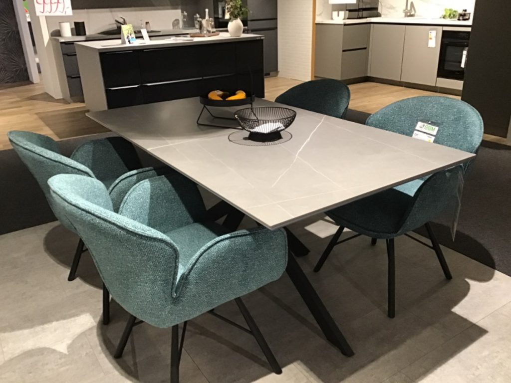 Moderner Esstisch ausziehbar in Marmoroptik und schwarzem Metallgestell.
