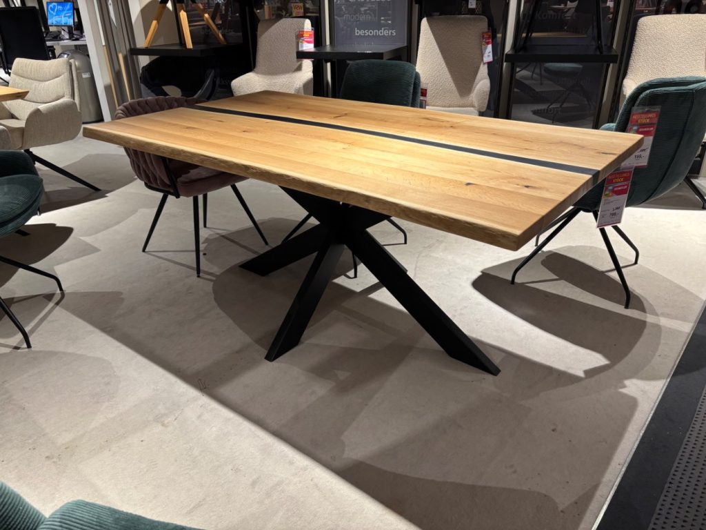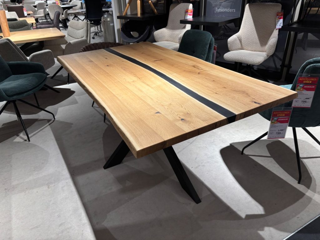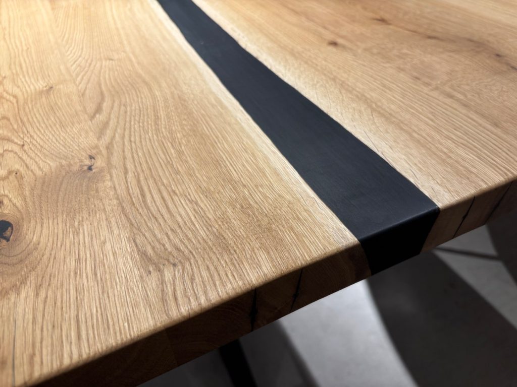 Esstisch in Wildeiche massiv geölt Platte Baumkante, Harzausschnitte schwarz gefüllt, massiv, Plattenstärke ca. 4 cm, mit Epoxid-Harz Füllung, Metalluntergestell Spinne, schwarz pulverbeschichtet
