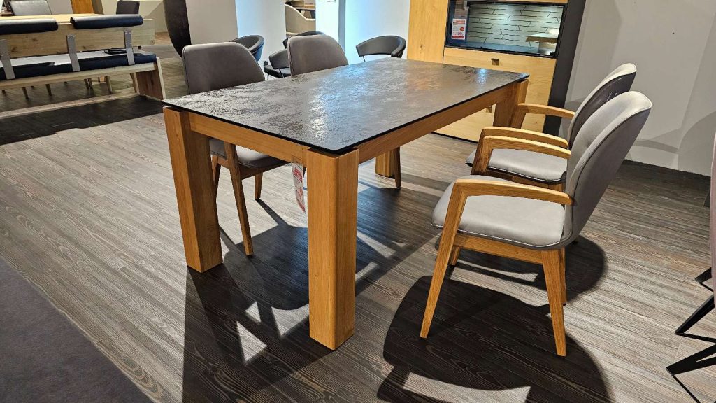 Der stabile 4-Fuß aus abgerundetem, massivem Wildeichenholz sorgt für einen soliden Stand und ist aufgrund der integrierten Rollen auf einer Seite einfach zu bewegen, ohne den Boden zu beschädigen. Die Kombination aus den natürlichen Holzelementen und der modernen Keramikplatte macht diesen Tisch zu einem Blickfang in jedem Essbereich und ideal für gesellige Runden oder größere Dinnerpartys. Als Ausstellungsstück bietet der Roca Esstisch von NIEHOFF nicht nur hochwertige Materialien, sondern auch ein Design, das in jeder Umgebung eine gute Figur macht.
