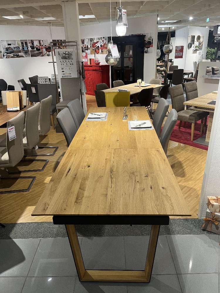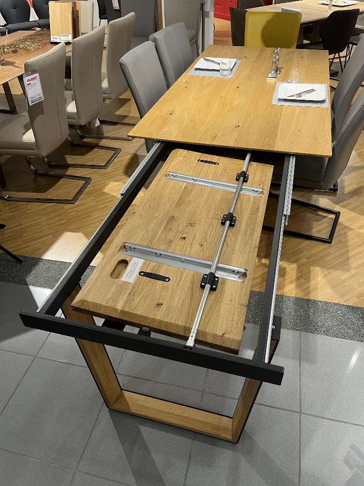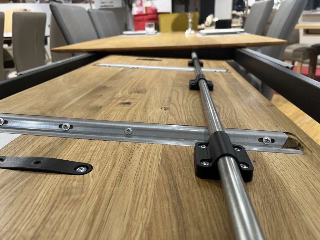 MaßeFalteinlage 100 cm Gestell: Trapez-Kufen-Gestell Eisen schwarz mit Eiche massiv Inlay Front-Slide ca. 180(280)x95 cm einseitig mit integrierten Rollen Alternativ auch bestellbar in der Größe: 200x95 cm