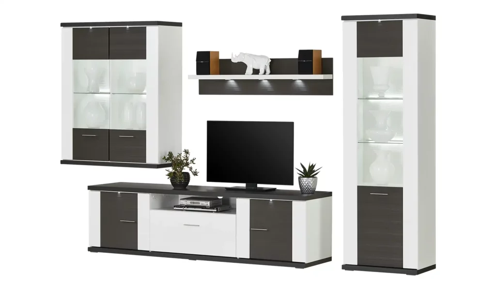 Bemerkung Die Wohnwand "Titan" vereint modernes Design und Funktionalität in Ihrem Wohnzimmer. Die strahlende Front in Hochglanz weiß Arctic wird durch Absetzungen in graphit geschroppt harmonisch ergänzt und setzt stilvolle Akzente. Die Hängevitrine bietet durch ihre Holz- und Glastüren einen eleganten Ort zur Präsentation Ihrer Lieblingsstücke. Das Lowboard bietet mit seinen geschlossenen Fächern und dem offenen Bereich vielseitige Einsatzmöglichkeiten, während das Wandpaneel mit Boden zusätzliche Gestaltungsspielräume schafft. Die Vitrine, ebenfalls mit Holz- und Glastüren ausgestattet, rundet das Ensemble ab. Besonders hervorzuheben ist die integrierte LED-Frontbeleuchtung, welche die einzelnen Elemente gekonnt in Szene setzt. Die Rückwände in 3D-Optik verleihen dem Gesamtbild Tiefe und Modernität. Dank der Glasboden- und Rückwandbeleuchtung werden besondere Akzente gesetzt, während die Nischenbeleuchtung in Kaltlicht ein klares und angenehmes Ambiente schafft. Praktisch ist auch der im Lieferumfang enthaltene Trafo und das Verlängerungskabel mit Fußschalter, die für eine einfache Bedienung sorgen. Mit ihren Maßen von 323 x 207 x 52 cm bietet die Wohnwand "Titan" genügend Platz und bleibt dennoch platzsparend.