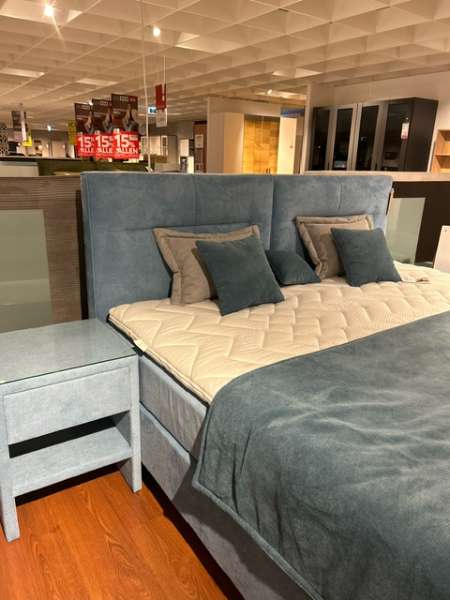 Bemerkungblaues Boxspringbett ORIGINAL verpackt zu verkaufen inkl. Nachtkästchen, Decke und Kissen