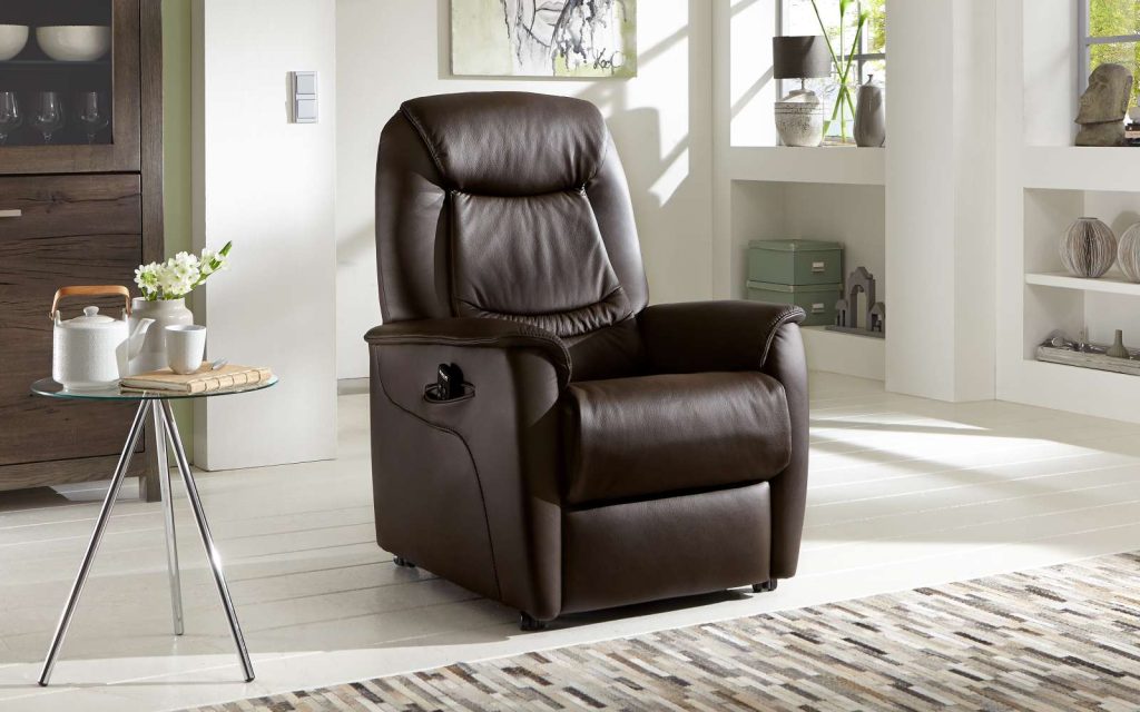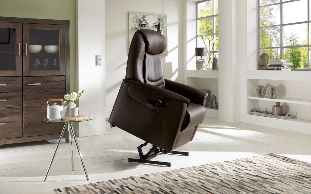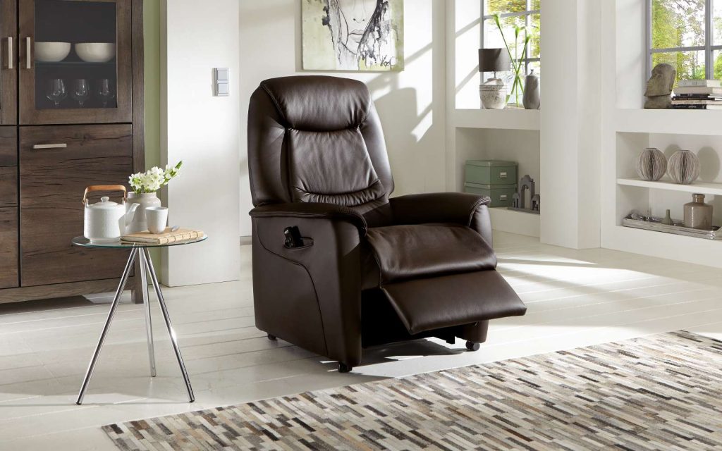 Bemerkung Fernsehsessel aus Leder in schoko, bequeme Polyätherschaum Polsterung auf Stahlwellen-Federn, Doppelrollen Füße, inklusive synchrone Verstellung der Rückenlehne und Beinauflage durch 1 Elektromotor mit zusätzlicher Aufstehhilfe bis ca. 110 kg. B/H/T ca. 77 x 106 x 82 cm.