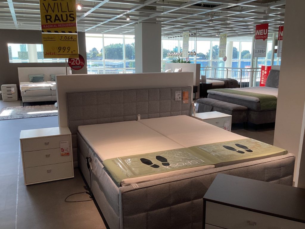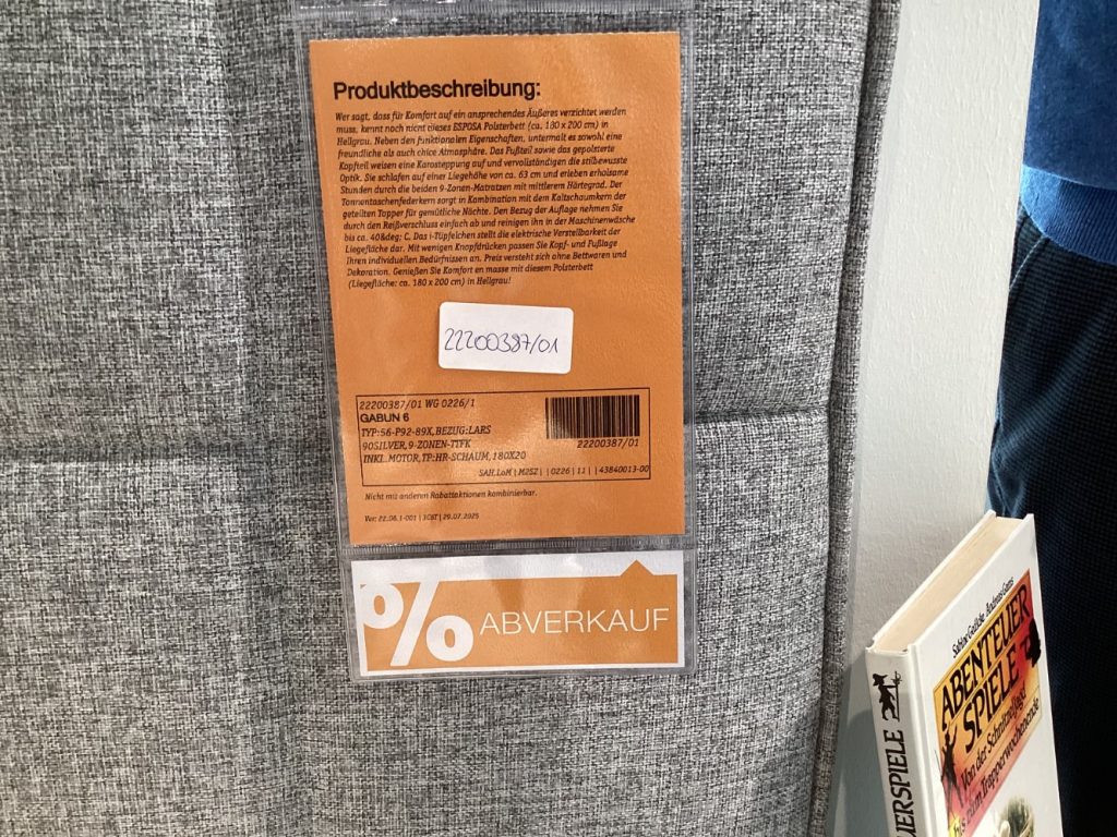 BemerkungDas „Gabun 6“ Boxspringbett in einem eleganten Hellgrau bringt Funktionalität und Komfort auf ein neues Level. Die großzügige Liegefläche von 180x200 cm bietet ausreichend Platz für erholsamen Schlaf. Als Ausstellungsware vereint es stilvolles Design mit einer hochwertigen Verarbeitung aus feinem Stoff, der sich angenehm in jede moderne Schlafzimmerumgebung einfügt. Die motorische Verstellung ist das Herzstück dieses Bettes: Beide Seiten lassen sich individuell elektrisch anpassen, um Ihnen den größtmöglichen Komfort zu ermöglichen. Mit der beigefügten Fernbedienung können Sie die Liegepositionen mühelos einstellen, um optimalen Komfort zu jeder Tages- und Nachtzeit zu gewährleisten. Dieses Bett bietet Ihnen die Freiheit, Ihre Wohlfühlposition für Ruhe oder eine entspannte Lesestunde zu finden, und macht es zu einem unverzichtbaren Teil jedes luxuriösen Schlafzimmers.
