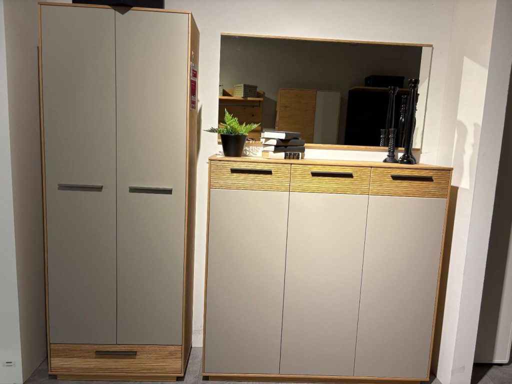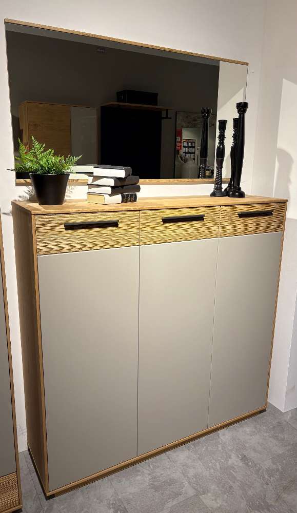 BemerkungDas Garderoben Set "Loveno" von VOSS MOEBEL ist die perfekte Ergänzung für Ihr Zuhause. Bestehend aus einer eleganten Schuhkommode, einem stilvollen Garderobenschrank und einem großen Wandspiegel, bietet dieses Set sowohl Funktionalität als auch ästhetische Anziehungskraft. Die Schuhkommode mit den Maßen BHT 127x124x37 cm bietet reichlich Platz für Ihre Schuhsammlung und hält Ihren Eingangsbereich stets aufgeräumt. Der Garderobenschrank, gemessen bei BHT 72x193x37 cm, ergänzt den Stauraum optimal und sorgt für eine schlichte und geordnete Aufbewahrung Ihrer Kleidung. Der großzügige Spiegel mit den Maßen BH 123x61 cm rundet das Set ab und lässt Ihren Eingangsbereich erstrahlen.