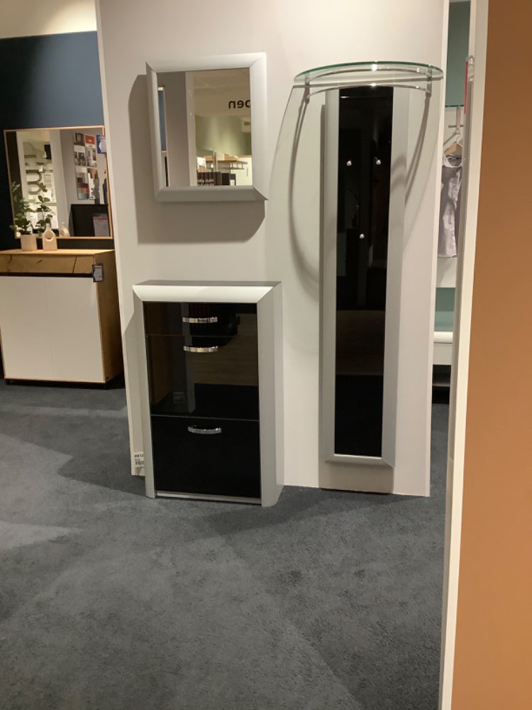 Glas schwarz/ Rahmen Alu geriffelt Bestehend aus: Schuhschrank B/H/T ca.: 66/103/25cm Garderobenpaneel B/H/T ca.: 62/170/30cm Spiegel B/H/T ca.: 54/60/8cm