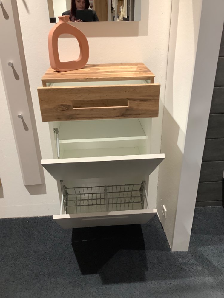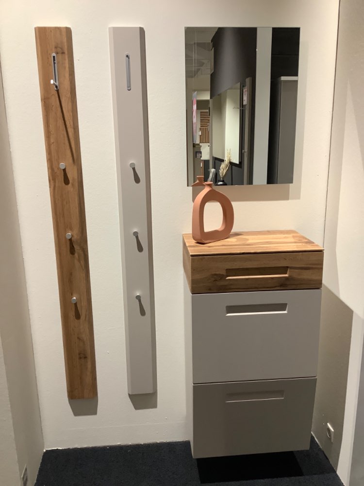 Korpus und Front: Sand matt, Absetzungen: Eiche Bestehend aus: Schuhschrank B/H/T ca.: 53/94/36cm Spiegel B/H/T ca.: 48/64/3cm 2x Paneel B/H/T ca.: 15/165/5cm