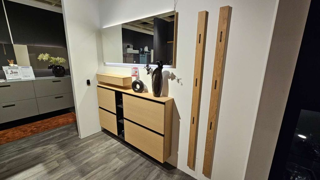 Tando überzeugt durch praktische Details, wie die beiden Schuhschränke mit Klappen und integrierten Schuhkörben, die Ihre Schuhsammlung ordentlich verbergen. Ein besonderes Highlight ist das Hängeregal, das einen ästhetischen Akzent setzt und Raum für zusätzliche Dekorationen bietet. Für optimale Beleuchtung sorgt der integrierte Lichtkanal mit LED-Beleuchtung, gesteuert durch eine Einkanal Funkfernbedienung. Die Rillenfront und der Spiegel ergänzen das Ensemble und verleihen Ihrer Garderobe einen Hauch von Raffinesse.