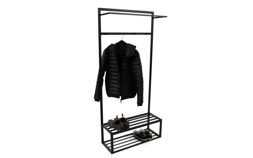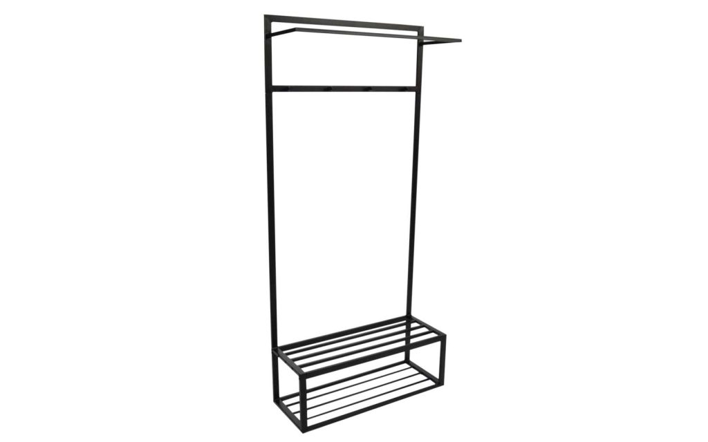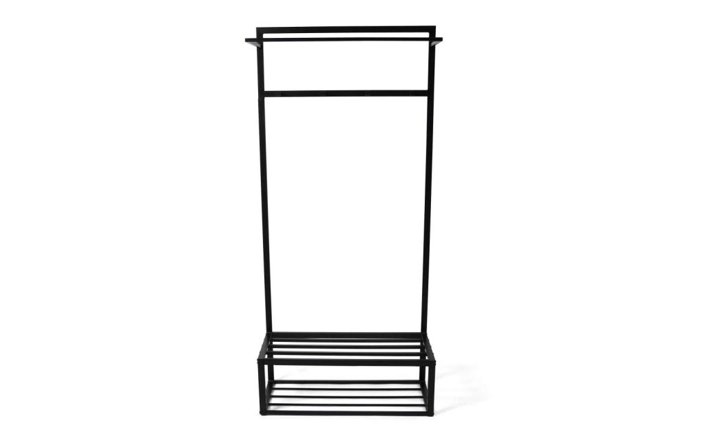 BemerkungGarderobe mit Gestell aus Metall in schwarz lackiert, 2 Ablageflächen für Schuhe, 2 Kleiderstangen für Jacken, Mäntel und Co, B/H/T ca. 80 x 175 x 30 cm.