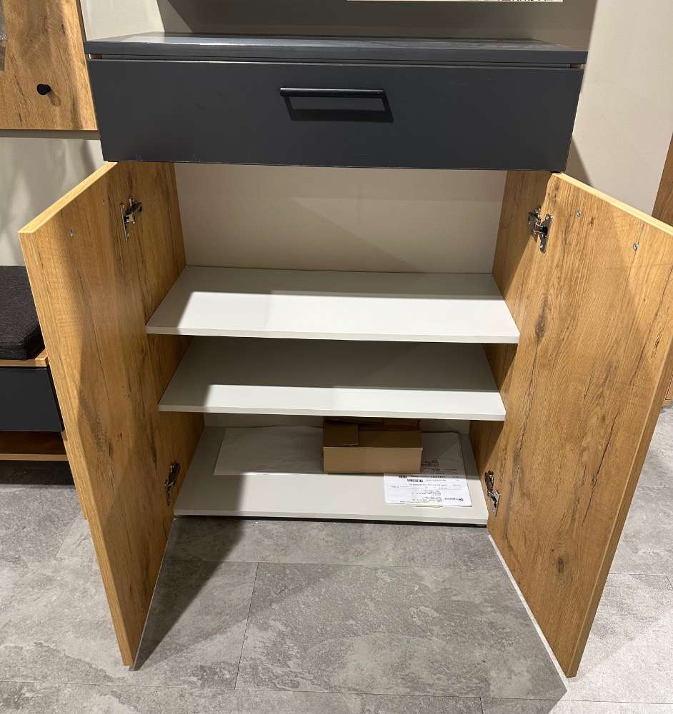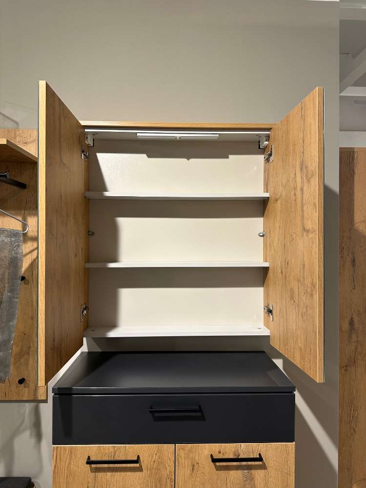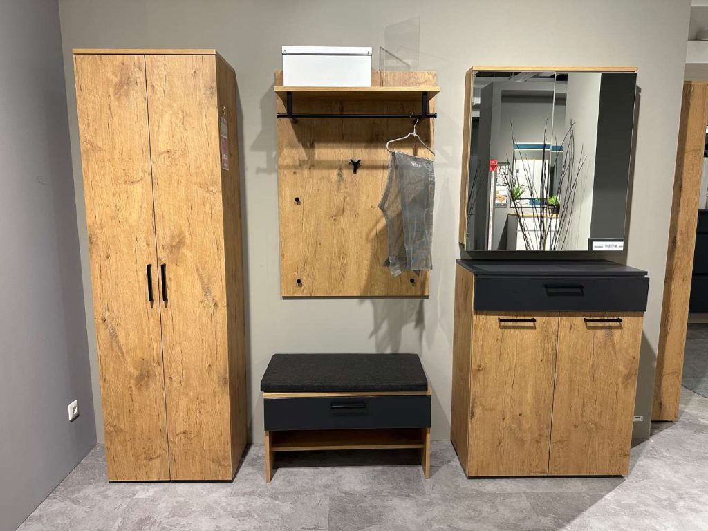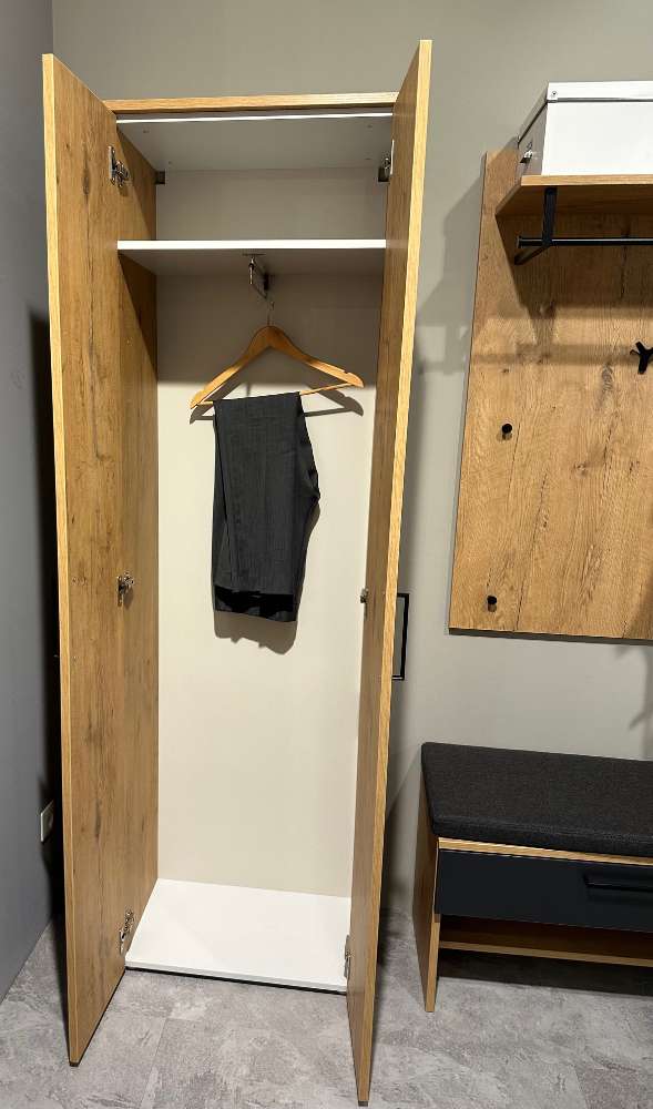 BemerkungDas Garderoben-Set Nostro von WITTENBREDER ist die ideale Lösung für alle, die Wert auf stilvolles Design und Funktionalität legen. Diese Ausstellungsware besticht durch ihre hochwertige Verarbeitung und durchdachte Aufteilung, die Ordnung und Eleganz in Ihren Eingangsbereich bringt. Der Kleiderschrank mit den Maßen 60x200x38 cm bietet großzügigen Stauraum für Ihre Garderobe und fügt sich harmonisch in jedes Raumkonzept ein. Ergänzt wird das Ensemble durch eine praktische Garderoben-Bank, die mit ihren Maßen von 80x46x38 cm nicht nur eine Ablagemöglichkeit, sondern auch eine bequeme Sitzgelegenheit mit einem integrierten Sitzkissen bietet.