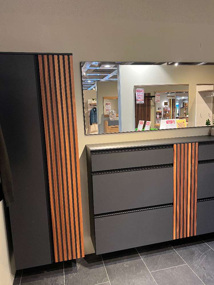 Bemerkung Dieses elegante Garderoben Set vereint modernes Design mit klassischen Materialien und bringt so Frische und Stil in Ihren Eingangsbereich. Die Kombination aus lackiertem Anthrazit und Kernnussbaum-Furnier schafft einen ansprechenden Kontrast, der jedem Raum eine zeitgemäße Note verleiht. Trotz ihrer Funktion als Ausstellungsware strahlt die Garderobe Qualität und Langlebigkeit aus, als wäre sie frisch produziert worden. Die sorgfältige Verarbeitung und die Liebe zum Detail machen dieses Set zu einem übersichtlichen und praktischen Begleiter für die Organisation von Mänteln, Jacken und Accessoires. Die natürliche Wärme des Nussbaumholzes harmoniert perfekt mit der kühlen Eleganz des anthrazitfarbenen Lacks, was dem Ensemble eine attraktive Balance verleiht. Perfekt für Liebhaber moderner und zugleich zeitloser Einrichtungslösungen, ist dieses Garderoben Set nicht nur ein praktischer Helfer, sondern auch ein stilvolles Statement in jedem Zuhause.