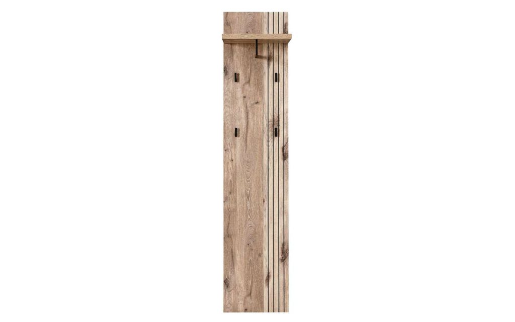 Bemerkung Garderobenpaneel mit einer Front aus MDF in Viking Oak Nature Nachbildung, 1 Hutablage mit Kleiderstange und 3 Garderobenhaken aus Metall in schwarz, B/H/T ca. 82 x 134 x 30 cm.