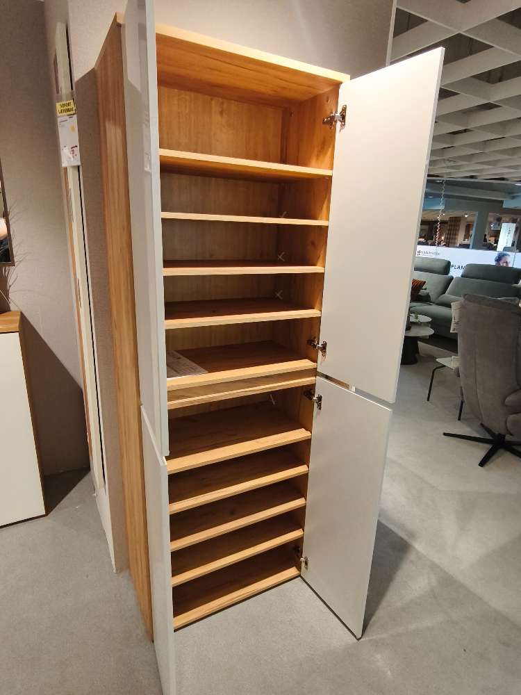 Bemerkung Dieser elegante Garderobenschrank vereint Funktionalität und Stil auf eindrucksvolle Weise. Die Fronten in edlem Weiß verleihen dem Schrank eine moderne, zeitlose Note, während der Korpus, das Abdeckblatt und die Einlegeböden in Navarra-Eiche NB für einen warmen Kontrast sorgen und ein Gefühl von natürlicher Eleganz in jeden Eingangsbereich bringen. Mit Abmessungen von ca. 70x199x41 cm bietet der Schrank ausreichend Stauraum, um Jacken, Mäntel und Accessoires ordentlich zu verstauen. Die durchdachte Innenaufteilung ermöglicht eine übersichtliche Organisation, sodass jederzeit alles griffbereit ist. Als Ausstellungsstück ist dieser Garderobenschrank nicht nur ein praktischer Helfer im Alltag, sondern auch ein stilvoller Blickfang, der das Ambiente Ihres Zuhauses unterstreicht und gleichzeitig eine einladende Atmosphäre schafft.