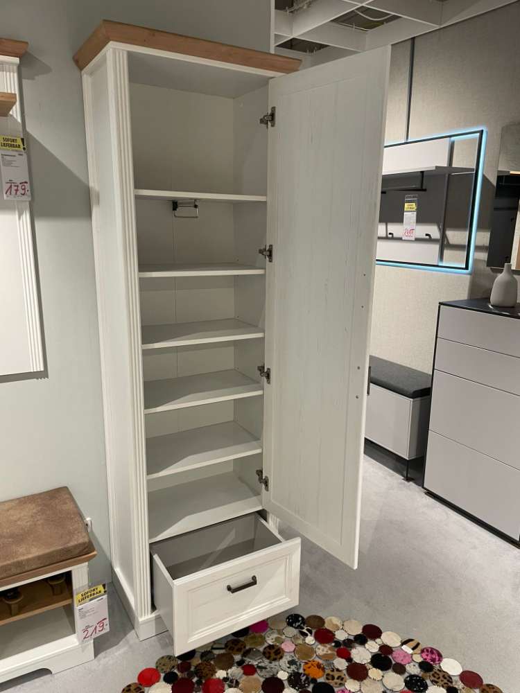 BemerkungDieser elegante Garderobenschrank überzeugt durch seine stilvolle Kombination aus einem hellen Pinienfarbton und einem Kranz in Artisan Eiche Nachbildung. Als Ausstellungsware bietet er eine exklusive Präsenz in jedem Raum. Mit einer Größe von ungefähr 65 cm in der Breite, 204 cm in der Höhe und 41 cm in der Tiefe ist er kompakt genug, um in kleinere Eingangsbereiche zu passen, ohne dabei auf geräumige Funktionalität zu verzichten.
