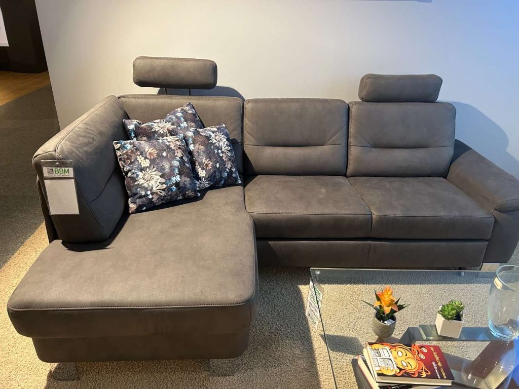 Bemerkung Diese luxuriöse Polstergarnitur in der Farbe Deluxe grau und aus hochwertigem Stoff gefertigt, ist ein wahres Highlight für jedes Wohnzimmer. Als Ausstellungsware bietet dieses Möbelstück sowohl Funktionalität als auch stilvolles Design. Die Garnitur begeistert durch ihre intelligente Ausführung mit einer 1,5-sitzigen Ottomane, die mit einem echten Rücken ergänzt wird, sowie einem 2,5-Sitzer mit Querschläferfunktion auf der rechten Seite. Die edlen Metallfüße in Chrom vollenden das insgesamt elegante Erscheinungsbild. Zusätzlich sorgt die in Blau gehaltene Nala-Polsterung für einen modernen Kontrast. Ein besonderes Merkmal ist die Ablage mit integrierter Steckdose auf der linken Seite, die Funktionalität und Komfort bei Ihrer Entspannung garantiert. Mit ihren großzügigen Maßen von 160x48x244 bietet die Garnitur ausreichend Platz für Familie und Freunde und fügt sich nahtlos in Ihr Wohnkonzept ein. Trotz ihrer eleganten Erscheinung bleibt die Polstergarnitur vielseitig und praktisch, was sie zu einem begehrenswerten Mittelpunkt Ihres Wohnzimmers macht.