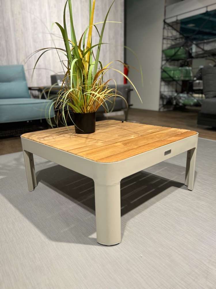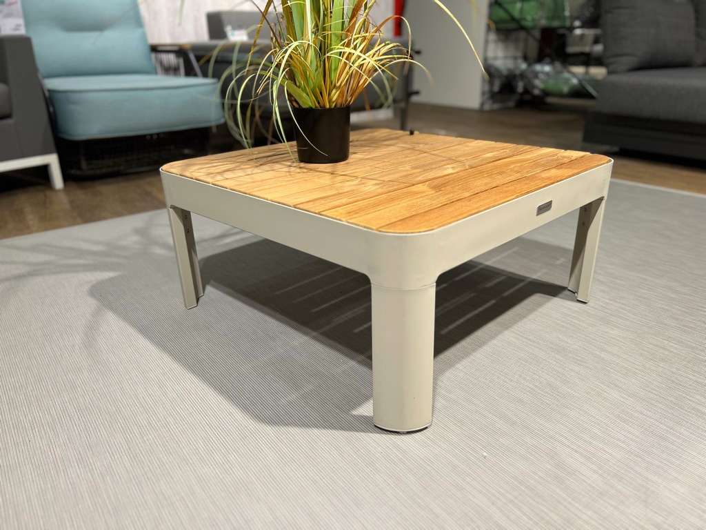 Alu Rahmen in Coralsand Tischplatte:Teak Holz Höhe:32 cm, 72 x 72 cm