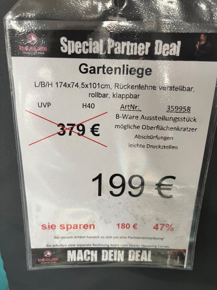 Bemerkung Mach deinen Deal! Hierbei handelt es sich um ein Angebot vom Dealer Shopping Center! Standort des Artikels ist Zeitz Kretzschau. Details wie technische Daten oder Schäden entnehmen Sie dem Bild mit Preis. BEZAHLUNG:  Bargeld, EC-Kartenzahlung, Kreditkarte oder 0% Finanzierung mit Consors Bank. RESERVIERUNG: Bei einem längeren Anfahrtsweg und vorheriger Absprache mit dem Verkäufer vor Ort ist eine Reservierung, für die Dauer der Fahrt -maximal  jedoch für 4 Stunden- möglich. Von Sonderanfragen bitten wir abzusehen. WICHTIG Bitte telefonisch erfragen ob der Wunschartikel noch verfügbar ist. Zwischenverkauf vorbehalten. Die Besichtigung, der Verkauf und die Abholung erfolgt ausschließlich bei unserem Handelspartner. Dealer Shopping Center , 06712 Kretzschau Zeitz Grana, Leipziger Straße 18, Ihren Ansprechpartner erreichen Sie telefonisch unter 015906377060 Öffnungszeiten : MO-FR 9:00-18:00 Uhr, SA 9:00 – 14:00 Uhr. Alle Inserate sind unverbindlich. Preisirrtümer und Änderungen vorbehalten. Abbildung ähnlich. Mehrere Rabattaktionen sind nicht kombinierbar. Weitere sichtbare Artikel können bei Verfügbarkeit zusätzlich erworben werden!