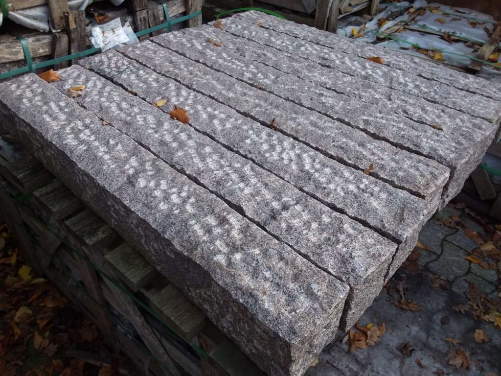 Granit Palisade in rötlich-grau in der Bearbeitung gespitzt.
