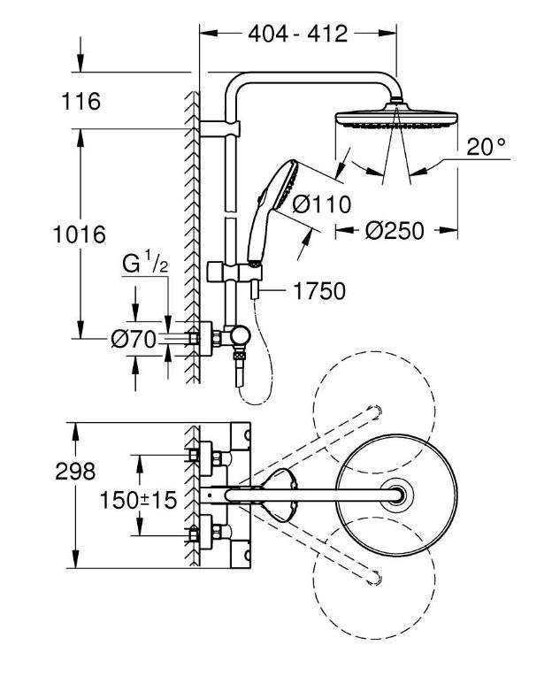 SONDERAKTION ! Neues GROHE TEMPESTA SYSTEM 250 DUSCHSYSTEM MIT THERMOSTATBATTERIE FÜR DIE WANDMONTAGE Nr. 26670001. Original verpackt mit 2 jähriger Gewährleistung. FLEXIBLE, LEISTUNGSSTARKE FUNKTIONEN MIT FORTSCHRITTLICHER TECHNOLOGIE FÜR EINE SICHERERE, UMWELTSCHONENDERE NUTZUNG IN ELEGANTER, MODERNER OPTIK – DAS GROHE TEMPESTA 250 CUBE DUSCHSYSTEM MIT THERMOSTAT IST DIE PERFEKTE WAHL FÜR DIE BADMODERNISIERUNG. HAUPTMERKMALE • bestehend aus: • horizontal schwenkbarer 390 mm Brausearm • Aufputz-Thermostat mit Aquadimmer Funktion • ermöglicht den Wechsel zwischen: • Kopfbrause Tempesta 250 (26 666) • Strahlart: • Rain • Kopfbrause mit weißer Rückseite • mit Kugelgelenk • Drehwinkel ± 10° • Handbrause Tempesta 110 (27 597) • 2 Strahlarten: • Rain, Jet • in der Höhe verstellbar mittels Gleitelement • Rotaflex TwistStop Brauseschlauch 1.750 mm 1/2" x 1/2" (28 410) • Maximaler Durchfluss (bei 3 bar): 8.5 l/min • GROHE Water Saving weniger Wasser, perfekter Wasserfluss • Maximaler Durchfluss (bei 3 bar): 7.3 l/min • GROHE TurboStat Kompaktkartusche mit Dehnstoff-Thermoelement • GROHE SafeStop Sicherheitssperre bei 38°C • GROHE SafeStop Plus optional einsetzbarer Temperaturendanschlag bei 43°C • GROHE SmartSwitch Strahlumstellung per Drehscheibe • GROHE DreamSpray Perfektes Strahlbild • ShockProof Silikonring schützt vor Beschädigung bei Herunterfallen der Brause • GROHE Long-Life Oberfläche • SpeedClean Antikalk-System • Innenliegende separate Wasserführung • TwistStop gegen Verdrehen des Brauseschlauchs • für Durchlauferhitzer ab 18 kW/h geeignet • Mindestdurchfluss 7 l/min • optionales Zubehör: GROHE EasyReach Ablage (26 362)