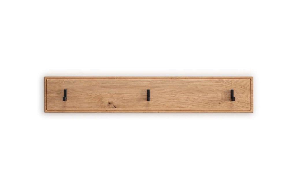 Hakenleiste mit Korpus und Front aus massiver, astiger Eiche, naturbelassen, geölt, 3 Haken in Schwarz, B/H/T ca. 80 x 14 x 4 cm.