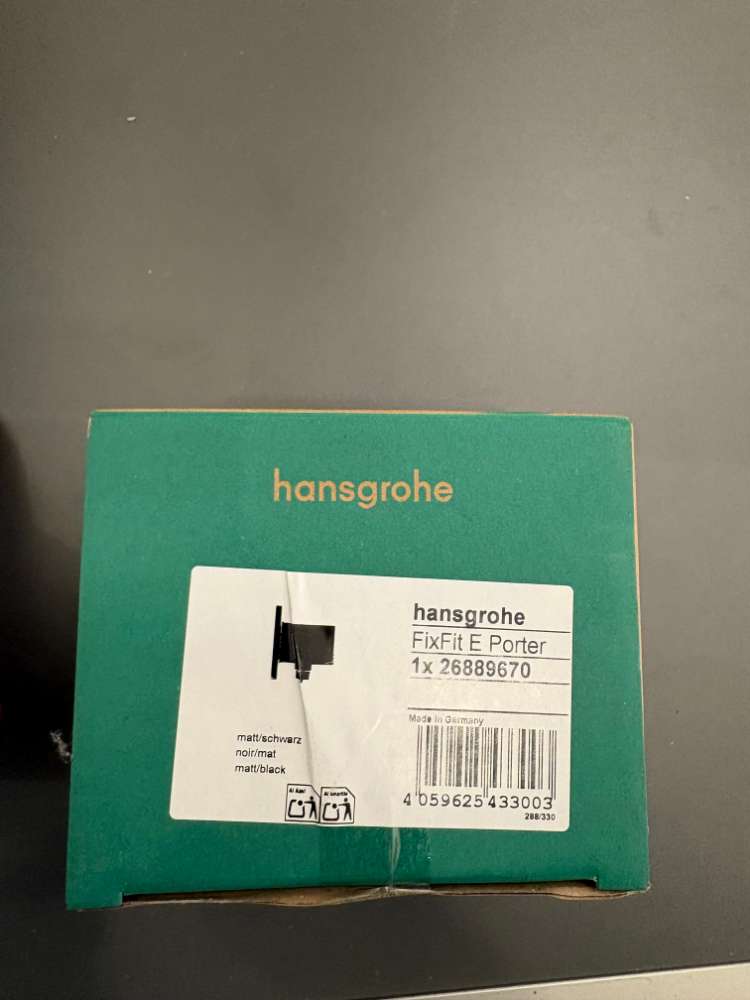 Bemerkung Produktinformationen FixFit E Duschhalterung mit interner Wasserversorgung Ausführung: schwarz matt Material: Kunststoff Zweiteilig Feste Halterung Für Schläuche mit konischer Mutter Mit Rückschlagventil Anschluss: G 1⁄2 Für alle Hansgrohe Handbrausen
