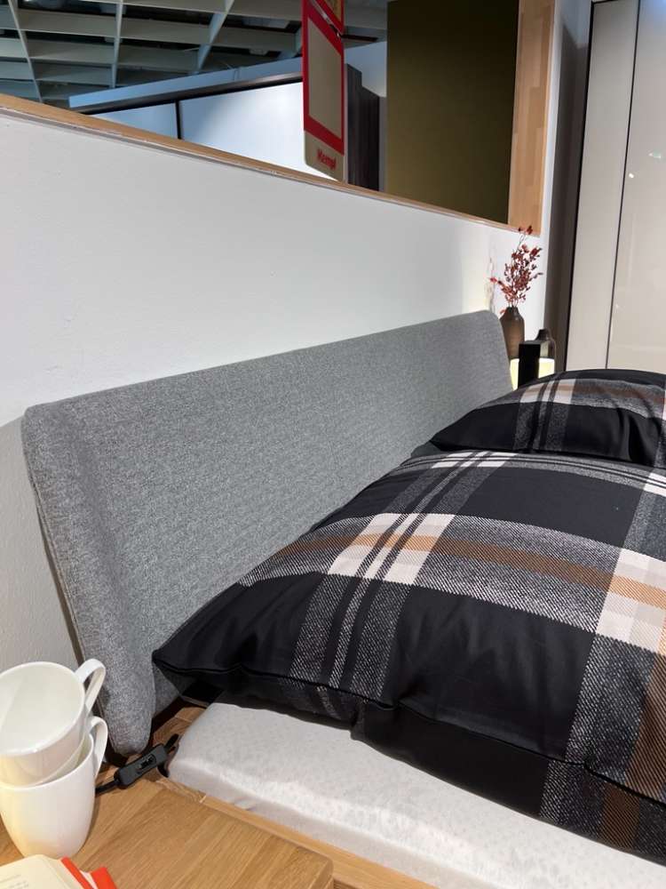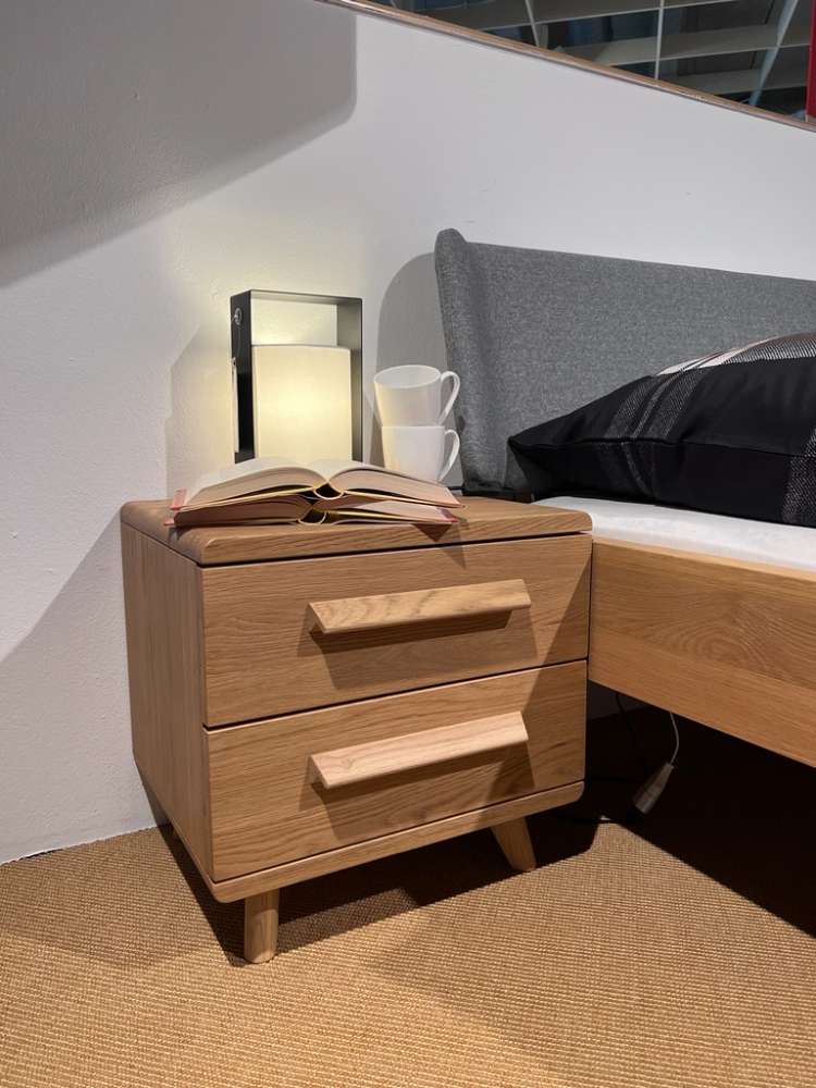 Bemerkung Bestehend aus: 1 x Doppelbettgestell Oak Bianco Modul ca. 180x200 cm Liegefläche Rahmen Holz Eiche Bianco gebürstet und geölt, ca. 18 cm hoch Kopfteil Boga in Stoff Kitana grigio 602 hellgrau Füße Masito, ca. 25 cm hoch Mitteltraverse --- 2 x Nachtkommode Oak Noma ca. 48x49x43 cm B/H/T Holz Eiche Bianco gebürstet und geölt Füße Sima, ca. 10 cm hoch 2 Schubkästen mit Soft-Close und Selbsteinzug --- Ohne Deko, Bettwäsche, Lattenroste und Matratzen