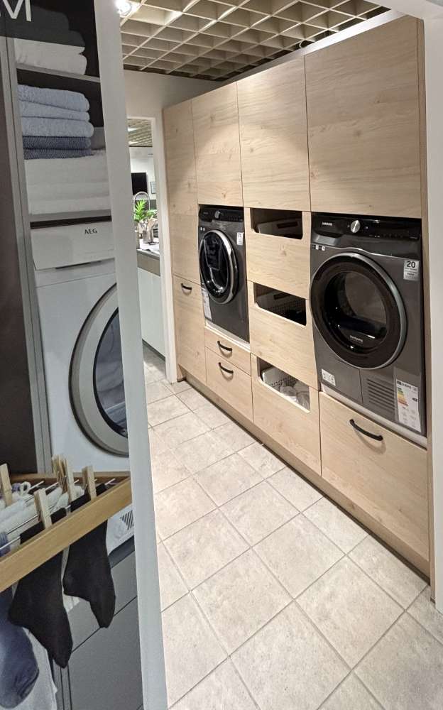 Der Art Wood Hauswirtschaftsraum bietet ausreichend Platz für die Integration von Waschmaschine und Trockner und ist somit die ideale Lösung für moderne Haushalte, die sowohl Effizienz als auch Ästhetik suchen. Die hochwertige Verarbeitung und die durchdachte Gestaltung garantieren eine nahtlose Integration in Ihr Zuhause, wobei die natürliche Asteiche-Optik ein warmes, einladendes Ambiente schafft. Dieser Raum bietet nicht nur Stauraum, sondern auch eine harmonische Verbindung von Nutzfläche und stilvoller Gestaltung, die auf die Bedürfnisse der modernen Wohnkultur abgestimmt ist.