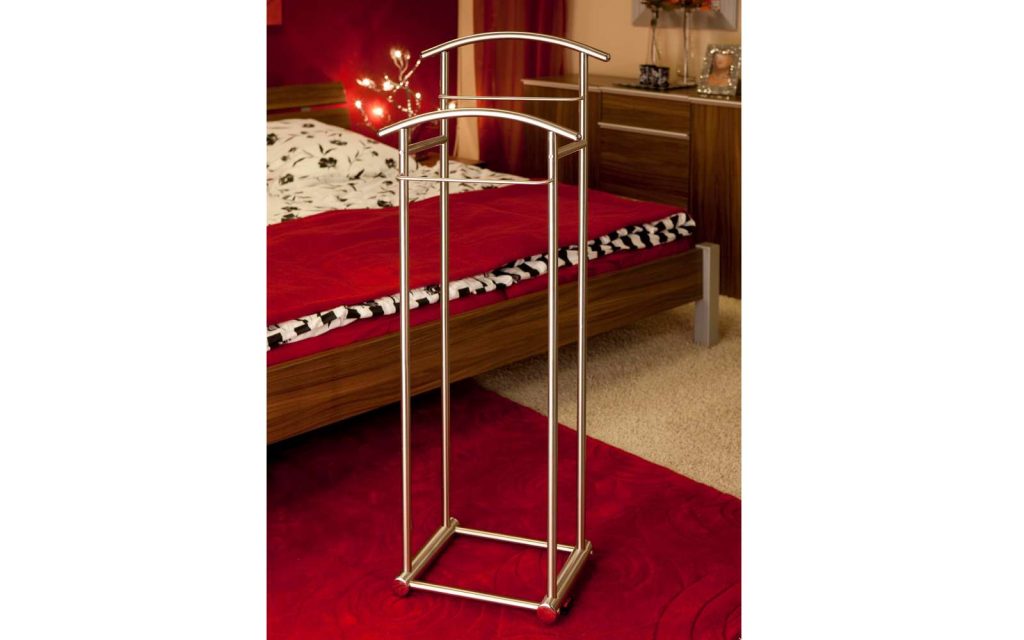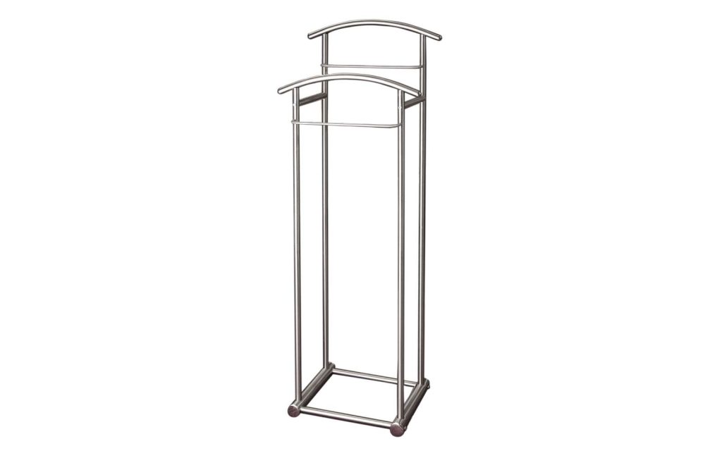 Herrendiener aus Metall in edelstahlfarbig, gebürstet, für knitterfreie Hosen, Anzugsjacken und Co. B/H/T ca. 43 x 114 x 30 cm.