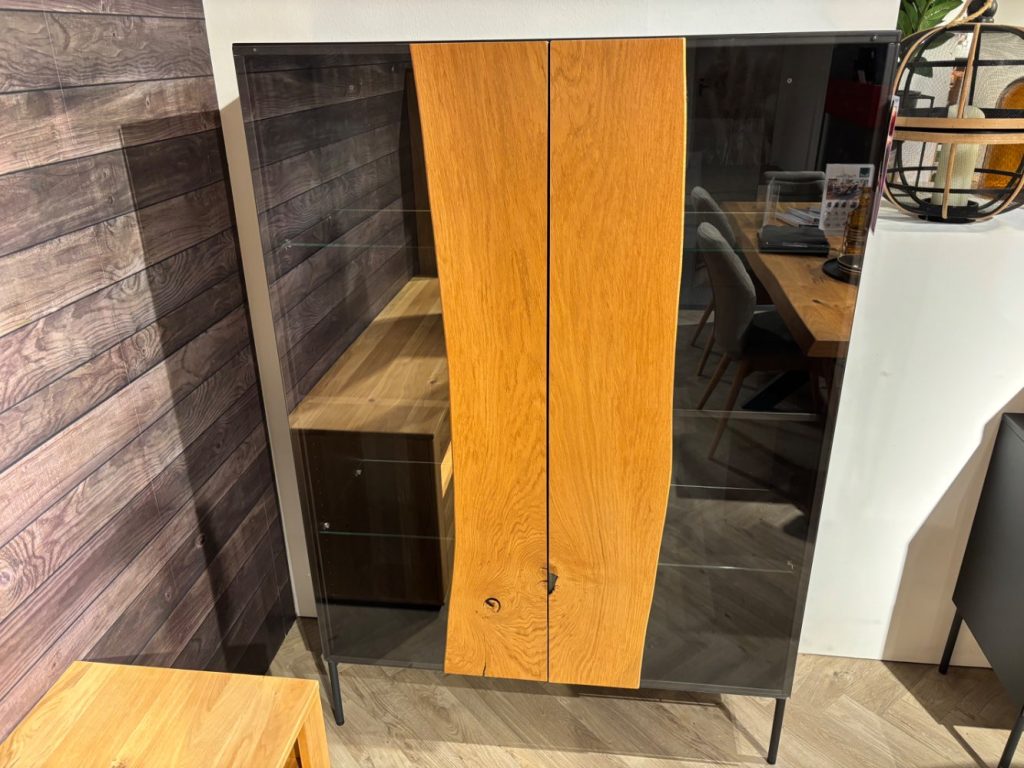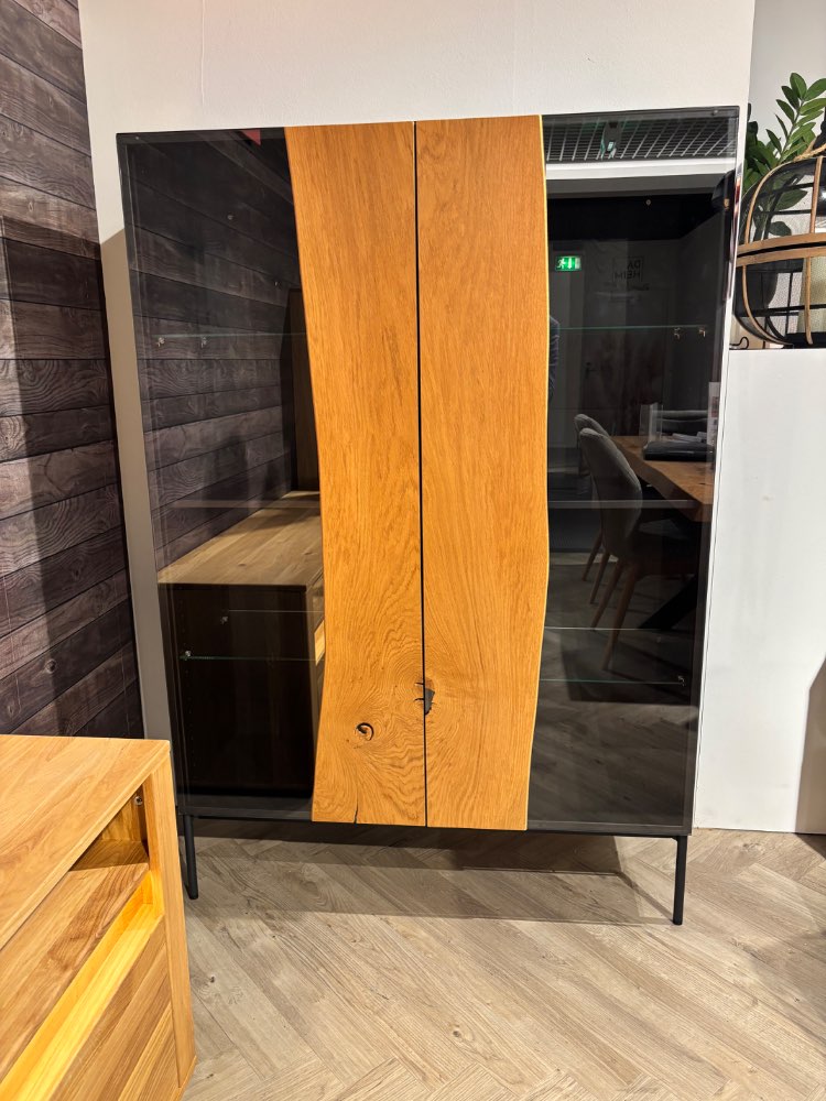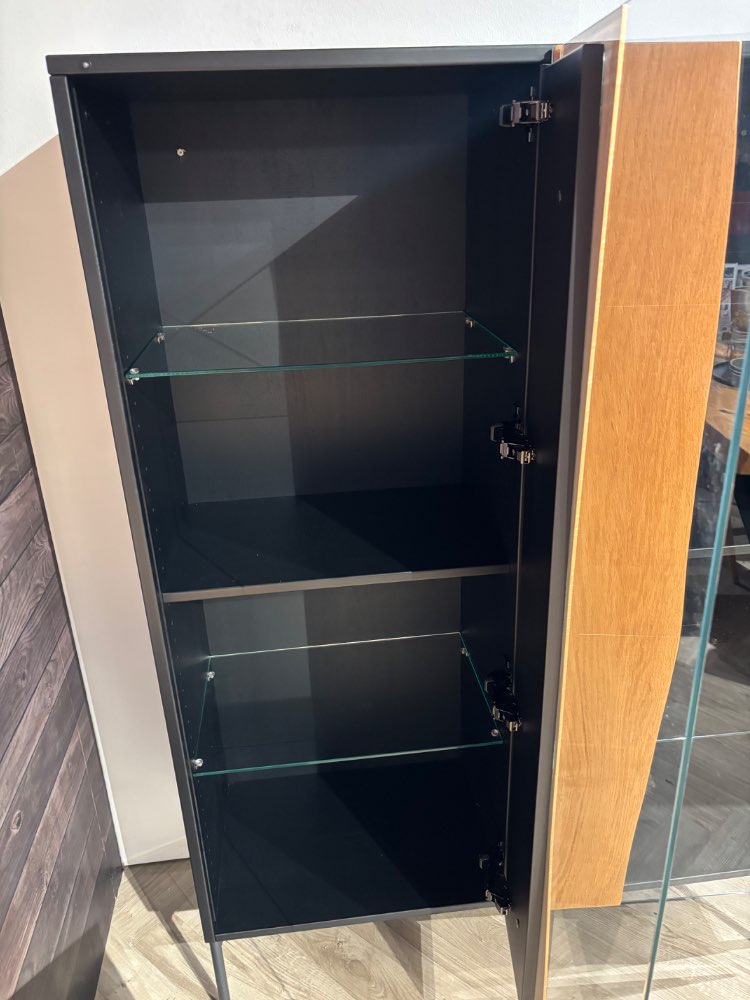 Bemerkung Highboard 18Hundert von Wimmer inklusive Beleuchtung 2 Türen (Tip-On) , 4 Glaseinlegeböden, 2 Konstruktionsböden Korpus: Buche massiv schwarz Metall: schwarzgrau Massivholz: Asteiche