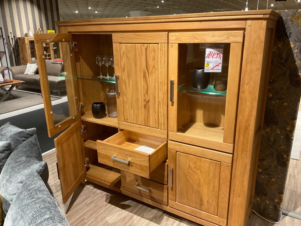 BemerkungDas Highboard SAGRES von QUADRATO ist ein wahres Schmuckstück und beeindruckt mit seiner hochwertigen Verarbeitung aus Wildeiche. In der ansprechenden Farbe Wildeiche Massiv strahlt das Möbelstück Wärme und Natürlichkeit aus, die jedem Raum eine behagliche Atmosphäre verleiht. Der Korpus des Highboards ist furniert und teilmassiv geölt, wodurch die natürliche Maserung des Holzes besonders zur Geltung kommt. Mit den Abmessungen von ca. 176 cm Breite, 165 cm Höhe und 47 cm Tiefe bietet das Highboard ausreichend Platz und ist dennoch kompakt genug, um sich harmonisch in unterschiedlichste Wohnkonzepte einzufügen. Die praktischen Funktionen des Highboards, bestehend aus zwei Glastüren, drei Holztüren und drei Schubkästen, bieten vielseitige Aufbewahrungsmöglichkeiten und ermöglichen eine übersichtliche Organisation. Der Holzfuß trägt zur stabilen Standfestigkeit bei und unterstreicht das natürliche Design des Möbels. Als Ausstellungsware präsentiert sich SAGRES nicht nur funktional, sondern auch als ästhetisches Highlight, das die Augen auf sich zieht und dem Wohnraum eine elegante Note verleiht.